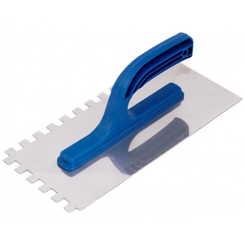 Терка с зубьями MAAN изготовлена из нержавеющей стали, оснащена пластиковой ручкой. Инструмент предназначен для работы с клеевыми составами, в том числе с сильной растекаемостью, для цементных монтажных смесей, на которые клеятся отделочные материалы – плитка, стеновые панели. Зубья, при нанесении раствора на рабочую поверхность, образуют канавки, которые заполняются во время приклейки, что позволяет более экономно использовать клеящие растворы.
