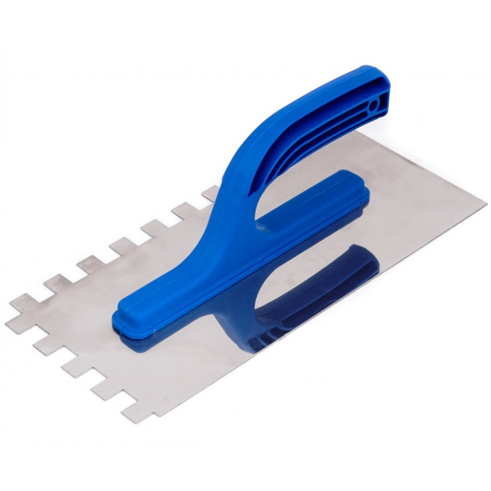 Терка с зубьями MAAN изготовлена из нержавеющей стали, оснащена пластиковой ручкой. Инструмент предназначен для работы с клеевыми составами, в том числе с сильной растекаемостью, для цементных монтажных смесей, на которые клеятся отделочные материалы – плитка, стеновые панели. Зубья, при нанесении раствора на рабочую поверхность, образуют канавки, которые заполняются во время приклейки, что позволяет более экономно использовать клеящие растворы.