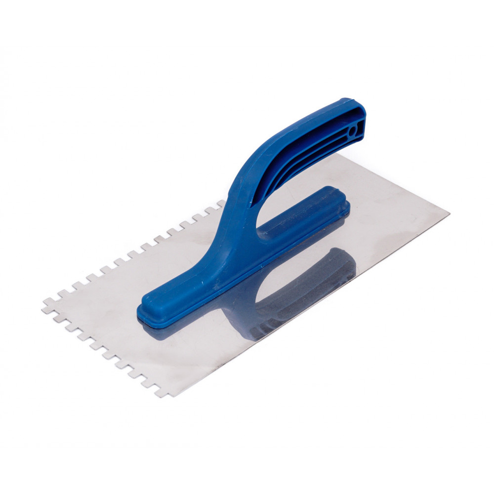 Терка с зубьями MAAN изготовлена из нержавеющей стали, оснащена пластиковой ручкой. Инструмент предназначен для работы с клеевыми составами, в том числе с сильной растекаемостью, для цементных монтажных смесей, на которые клеятся отделочные материалы – плитка, стеновые панели. Зубья, при нанесении раствора на рабочую поверхность, образуют канавки, которые заполняются во время приклейки, что позволяет более экономно использовать клеящие растворы.