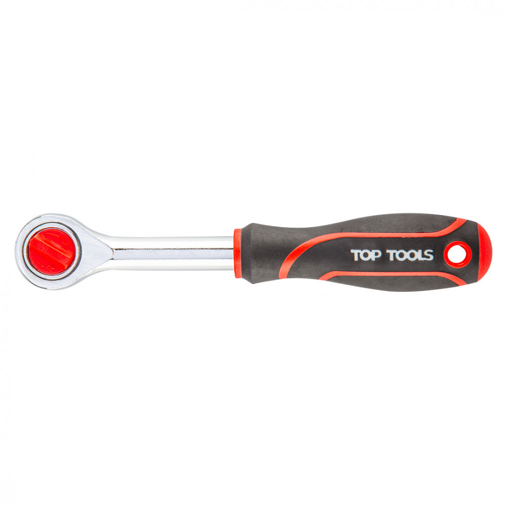 Ключ-трещотка 1/4, 150 мм, Top tools предназначен для быстрого монтажа резьбовых соединений. Имеется нескользящая прорезиненная рукоятка. Присоединительный квадрат с шариковым фиксатором надежно удерживает съемные торцевые головки различных размеров, удлинители, адаптеры. Храповый механизм с переключателем обеспечивает плавный ход и возможность быстрой смены направления вращения ключа.