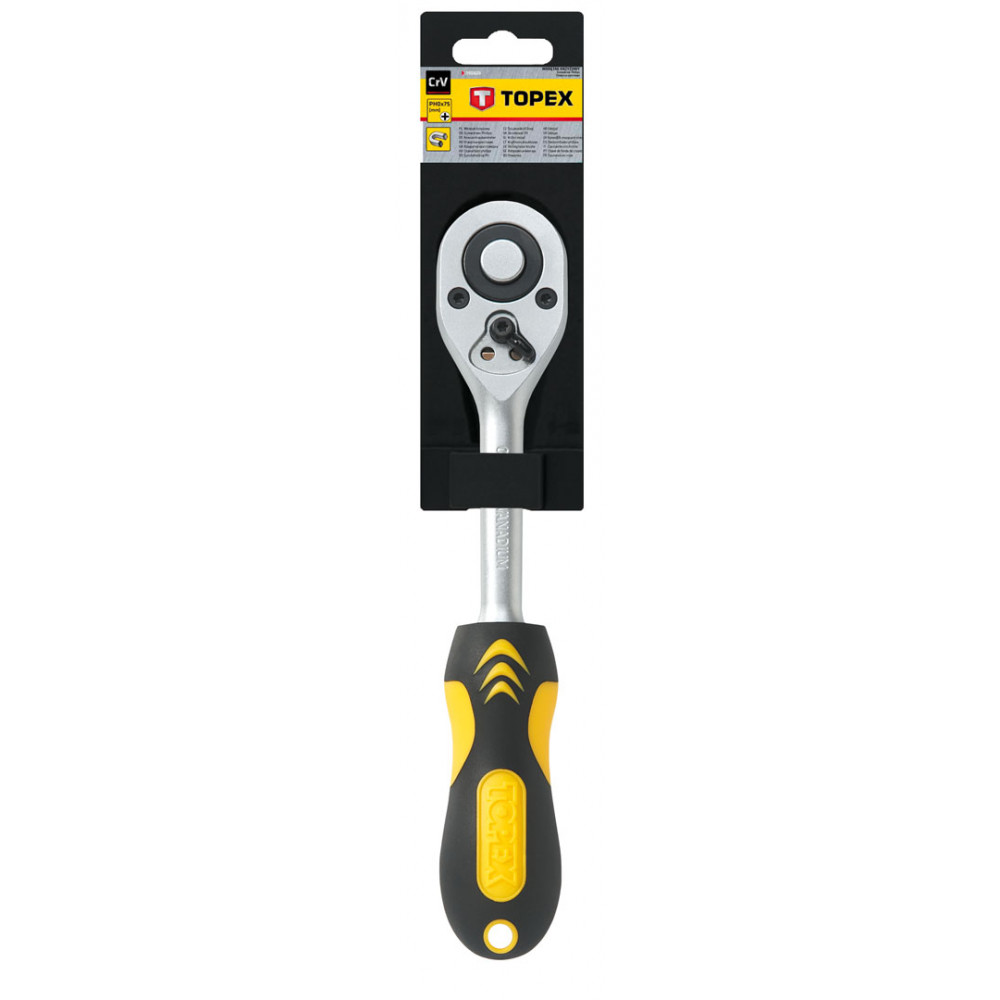 Трещотка TOPEX изготовлена из высококачественной хромованадиевой стали, обеспечивающей долгий срок службы инструмента. Оснащена храповым механизмом с 72 зубцами, а также переключателем направления вращения. Эргономичная пластмассовая рукоятка, покрытая антискользящим материалом, обеспечивает безопасность и комфорт во время работы. Исполнение в соответствии со стандартом DIN 3122 является гарантией надежности инструмента. Бренд TOPEX предназначен для домашних мастеров.