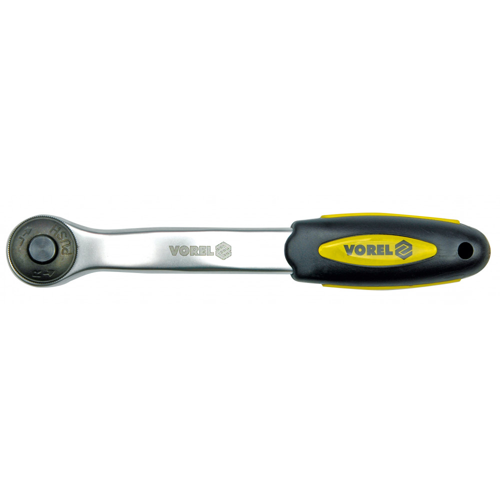 Изогнутая трещотка 53572 от VOREL с приводом 3/8 дюйма представляет собой специализированный ручной инструмент для монтажа различных гаек, имеющих резьбу, как с правой, так и с левой стороны.