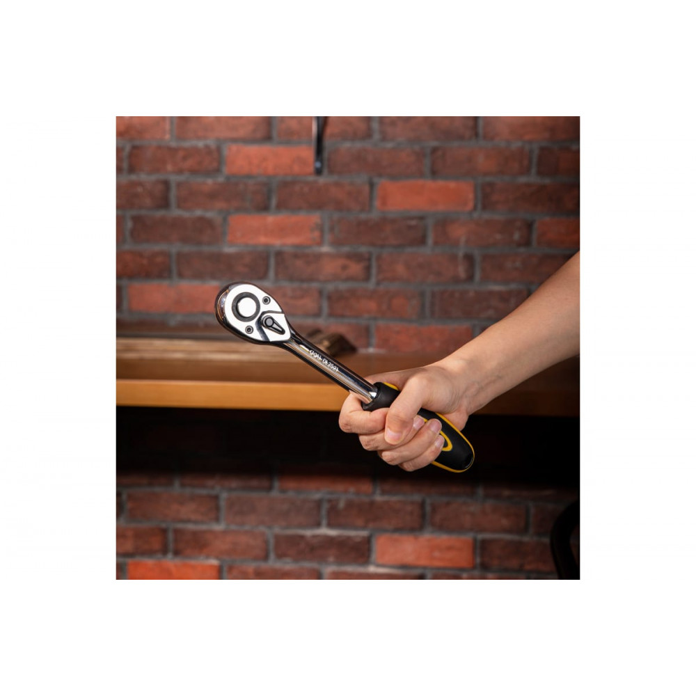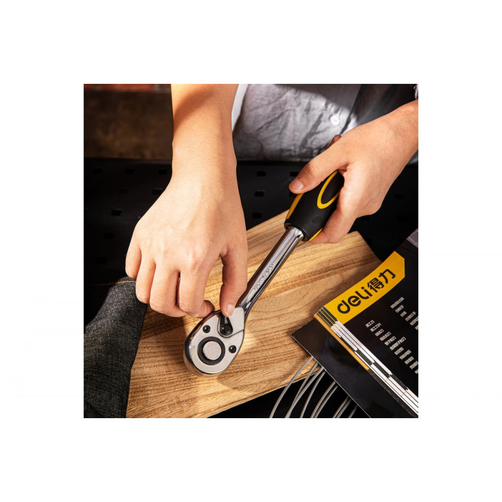 Трещотка Deli имеет длину 20 см и оснащена 45 зубьями, которые обеспечивают высокую скорость работы и удобство в использовании. Шестерня изготовлена из высококачественной Cr-Mo стали, что обеспечивает ее прочность и долговечность.Инструмент имеет эргономичную ручку, которая обеспечивает удобный захват и предотвращает выскальзывание из рук. Трещотка также имеет удобный механизм переключения, который позволяет легко переключаться между различными насадками.