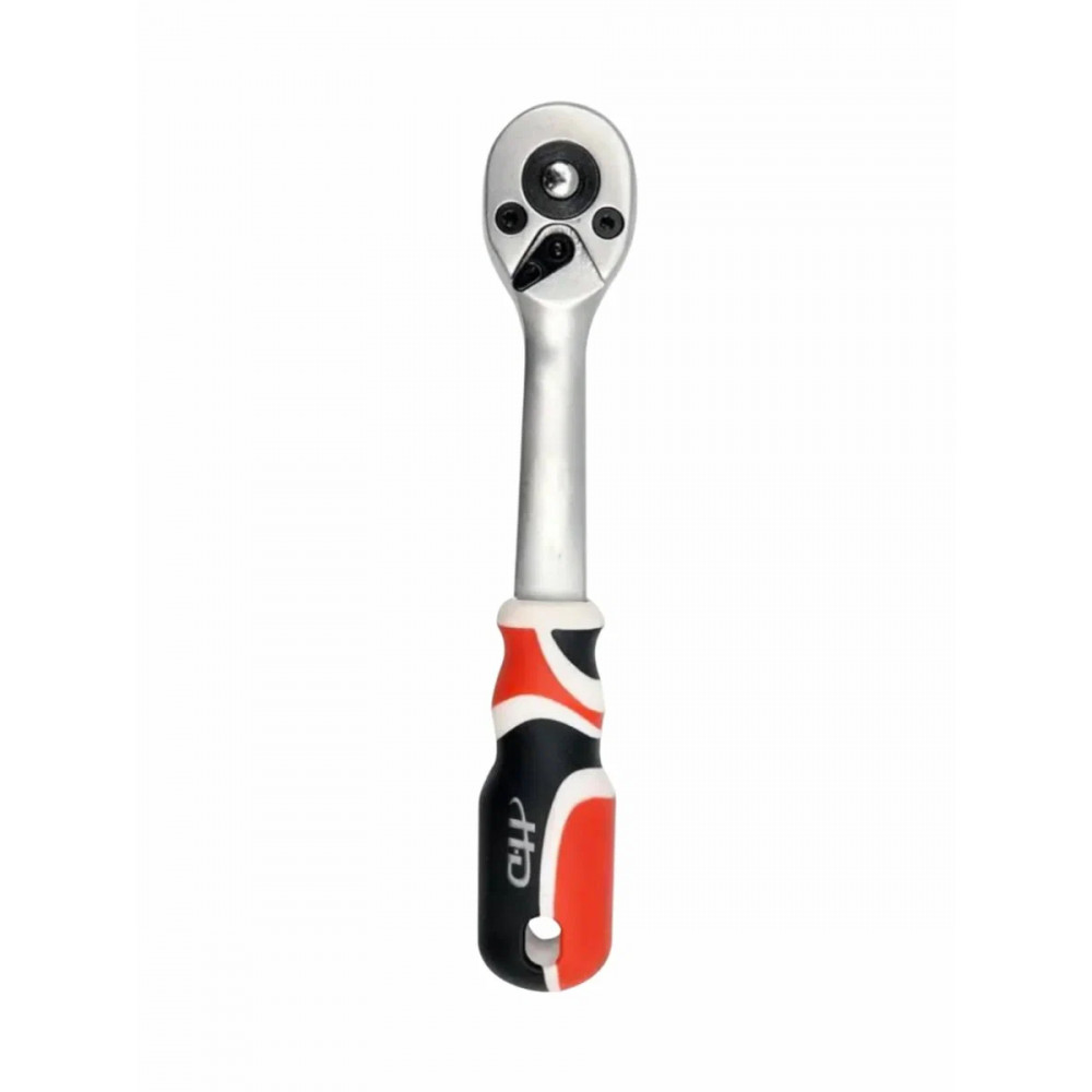 Ключ-трещотка для головок 1/4" Т72, длина 155 мм, модель HD-0730 (H-D). Этот трещоточный ключ изготовлен из прочной хромованадиевой стали CrV 6140, что гарантирует его долговечность даже при интенсивной эксплуатации. Рукоятка покрыта трёхцветным ПВХ для удобства и надежного хвата. Инструмент оснащён квадратом 1/4" и длиной 155 мм. Храповый механизм с 72 зубьями обеспечивает плавное и легкое вращение, а переключатель направления позволяет быстро менять режим работы. Ключ выполнен из высококачественной хромованадиевой стали с матовым покрытием, что повышает прочность и устойчивость к механическим нагрузкам. Удобство работы обеспечивает устройство быстрого сброса, которое надежно фиксирует головку и легко освобождает её нажатием кнопки. Этот реверсивный трещоточный ключ значительно удобнее обычного гаечного ключа. Он универсален и подходит для ремонта техники, сборки мебели, строительных работ, обслуживания и ремонта автомобилей — для монтажа и демонтажа резьбовых соединений. Рукоятка с мягким нескользящим покрытием обеспечивает надежный захват и комфорт в работе.