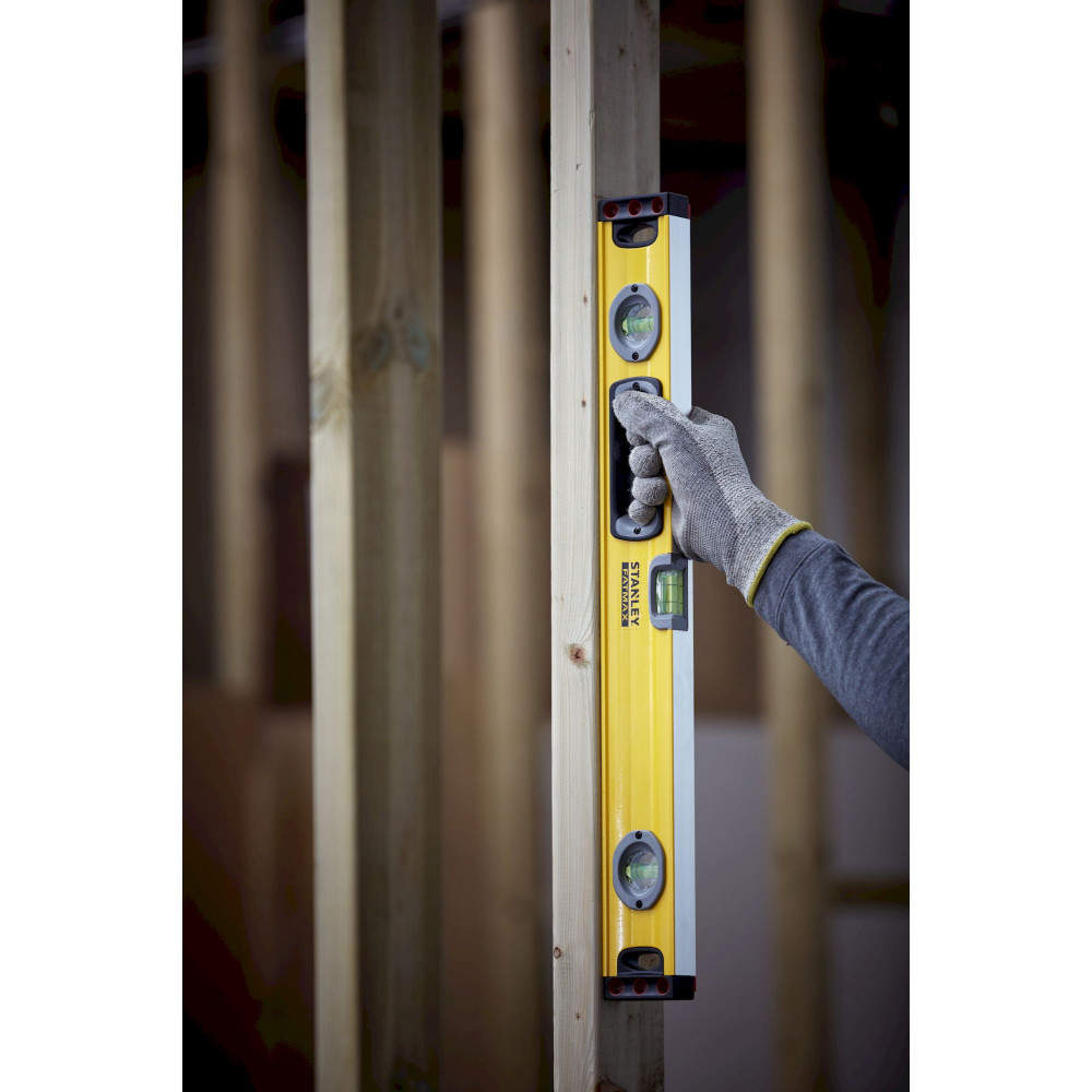 Профессиональный уровень 1-43-524 Fatmax level от STANLEY очень удобен в эксплуатации благодаря эргономичной рукоятке в форме отверстия, а две заглушки на концах обеспечивают дополнительную защиту от случайных ударов во время работы или падения инструмента. В процессе работы можно использовать две рабочие поверхности с одинаковой точностью.