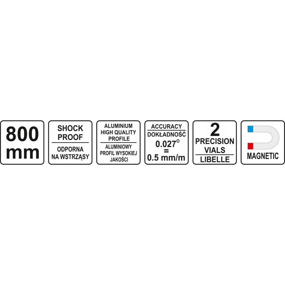 YT-30062 – это профессиональный инструмент от ТМ YATO. Представляет собой алюминиевый уровень с двумя капсулами из акрила, для надежности. Сам корпус сделан из высококачественного алюминия длиной 0,8 м. Вес 0,55 кг. Погрешность данного устройства составляет ±0,5 мм/м. Благодаря особым технологическим решениям, в капсулах получается четкий эффект увеличительного стекла.
