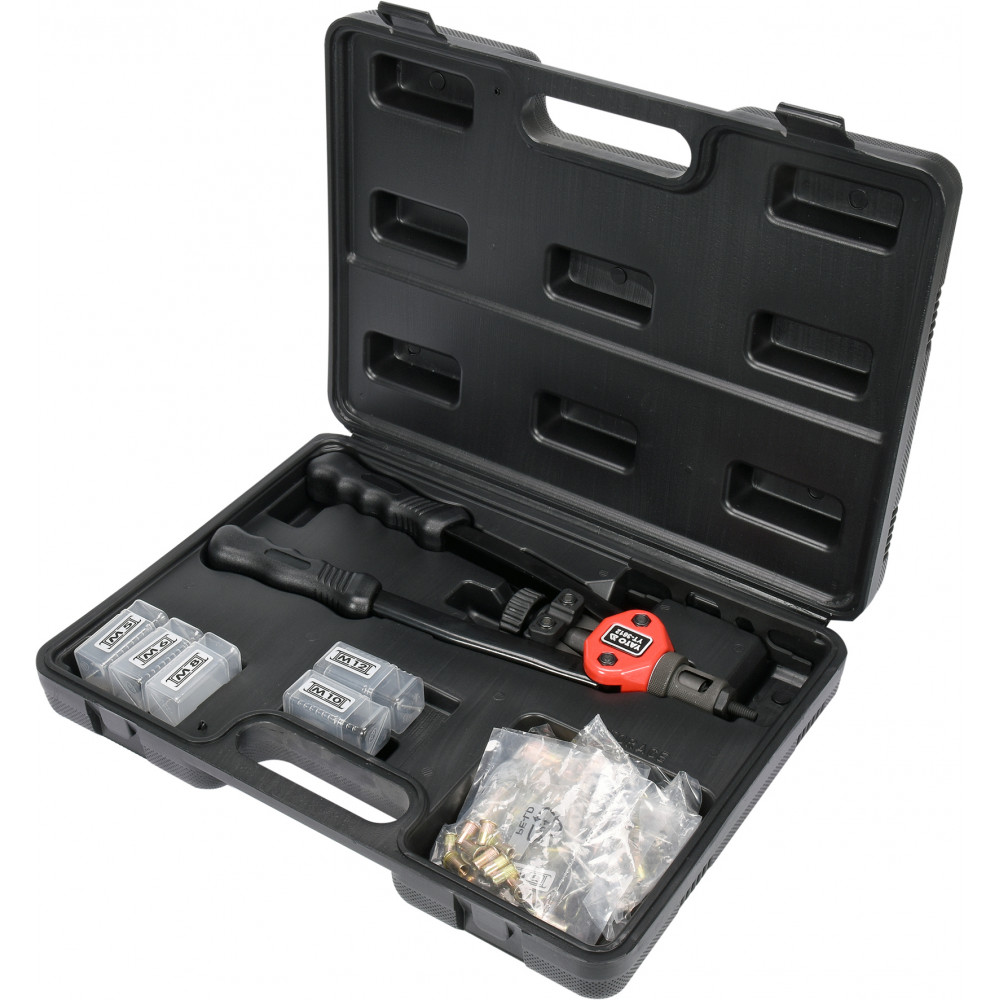 Особенностью данного заклепочника от ТМ YATO является применение именно резьбовой заклепки, которая в отличии от обычной, позволяет надежно соединять тонколистовые материалы, замыкая их. В комплекте присутствуют различные заклепки с резьбой.