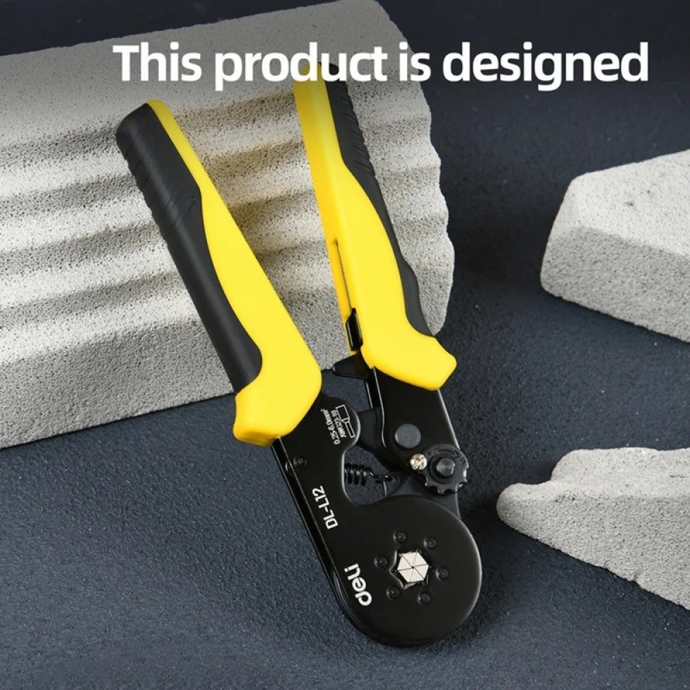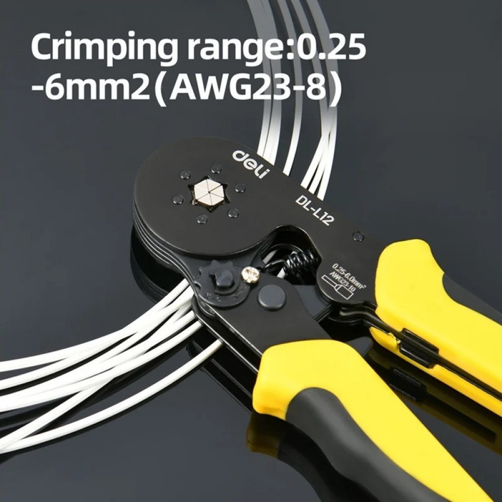 Deli DL-L12 — это профессиональный инструмент для обжима как изолированных, так и нейлоновых втулочных (гильзовых) наконечников на проводах. Обжим выполнен в виде шестигранного типа, что обеспечивает равномерное сжатие со всех сторон и формирует шестигранник вокруг провода, гарантируя надежное механическое и электрическое соединение. Диапазон сечения 0,25–6 кв. мм позволяет работать с разнообразными проводами, используемыми в электромонтаже. Этот инструмент предназначен как для профессионального, так и для бытового использования.