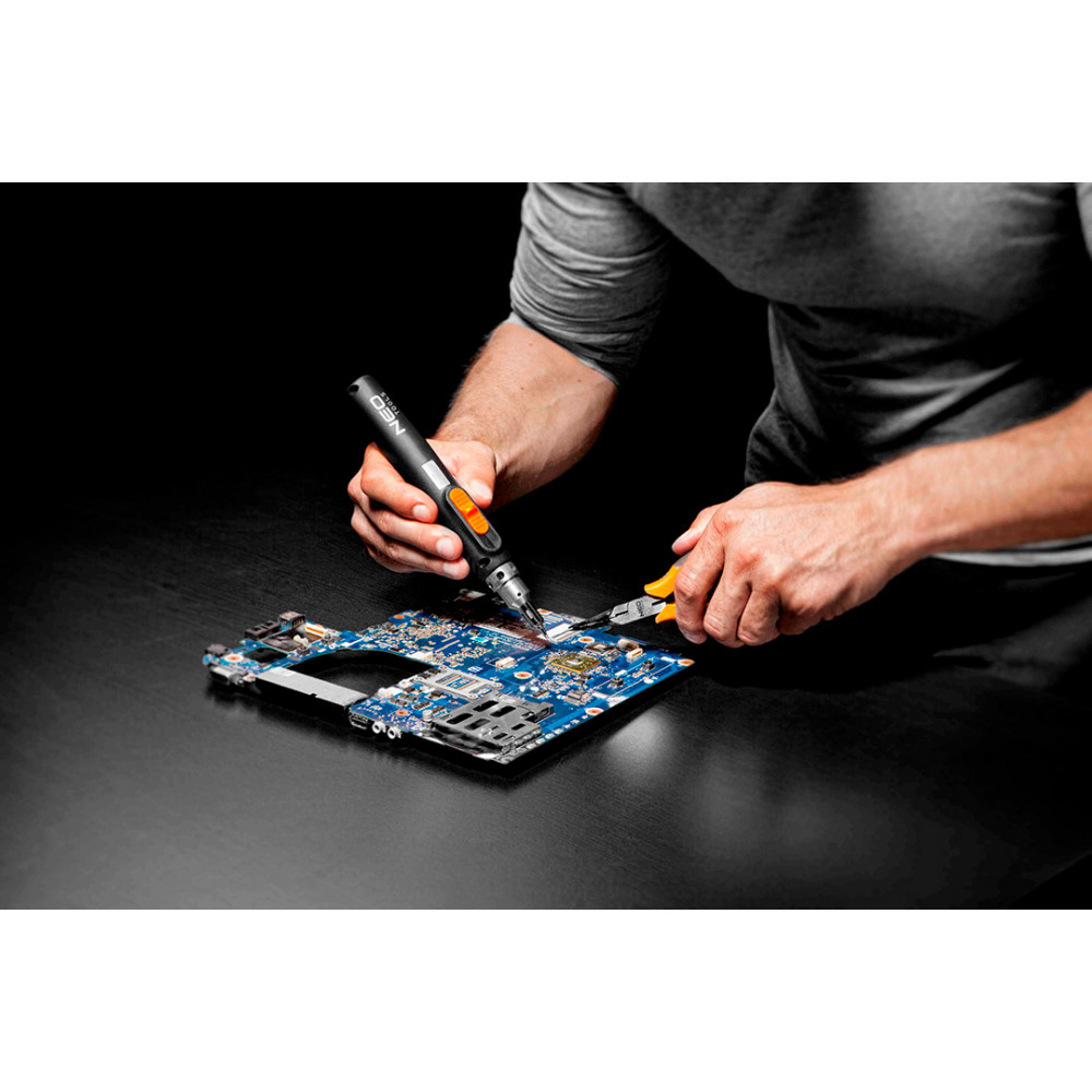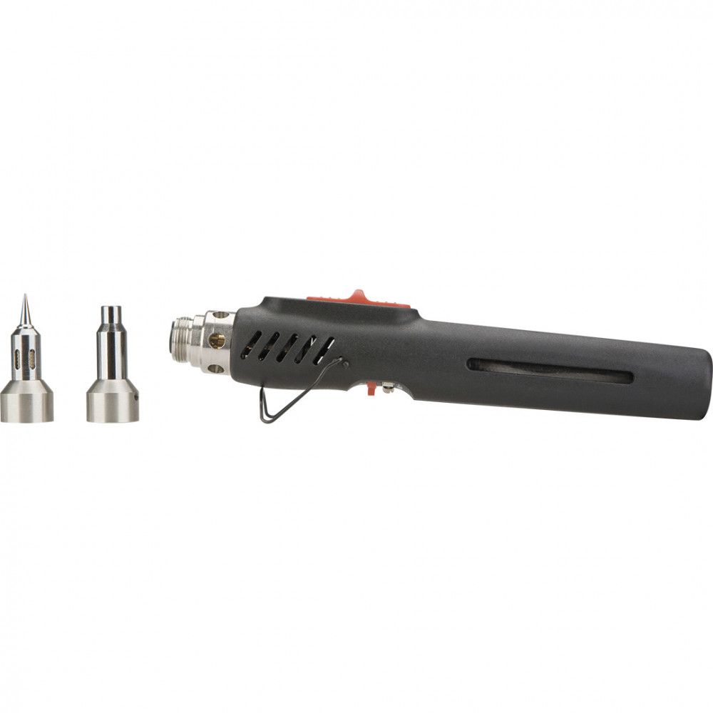 Микрогорелка 19-902 от NEO с пьезозажиганием, температура пламени 1300°C, температура жала паяльника 400°C, температура сопла 500°C. С безопасной блокировкой кнопки включения и регулировкой размера пламени. В комплекте имеется паяльная насадка. Высококачественная газовая горелка, отвечает условиям специалистов. Объем емкости для газа – 11 мл. Форма изделия повышает удобство работы.