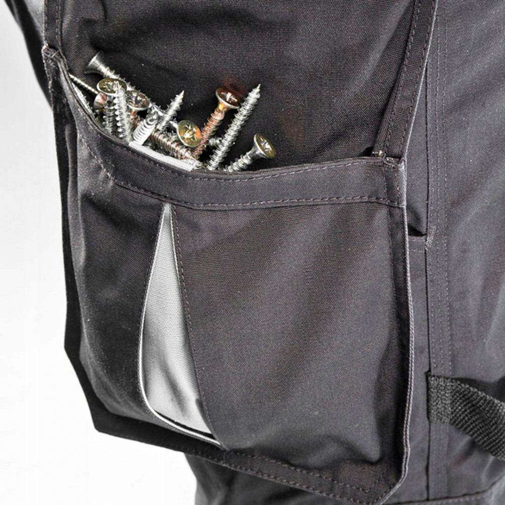 Изготовлены из специализированного смесового материала плотностью 267 г/м2. Тройная усиленная строчка обеспечивает дополнительную прочность соединений. Места, подверженные быстрому износу усиленны, благодаря чему брюки прослужат вам очень долго. Многофункциональные карманы с продуманным дизайном идеально подходят для небольших рабочих инструментов, имеют повышенную стойкость к истиранию. Предусмотрен карман для мобильного телефона. Кармашки для наколенников обеспечивают максимальную защиту коленей от механических воздействий во время работы в неудобном положении. Имеются также держатели для инструмента в виде петель, пришитых к карману.