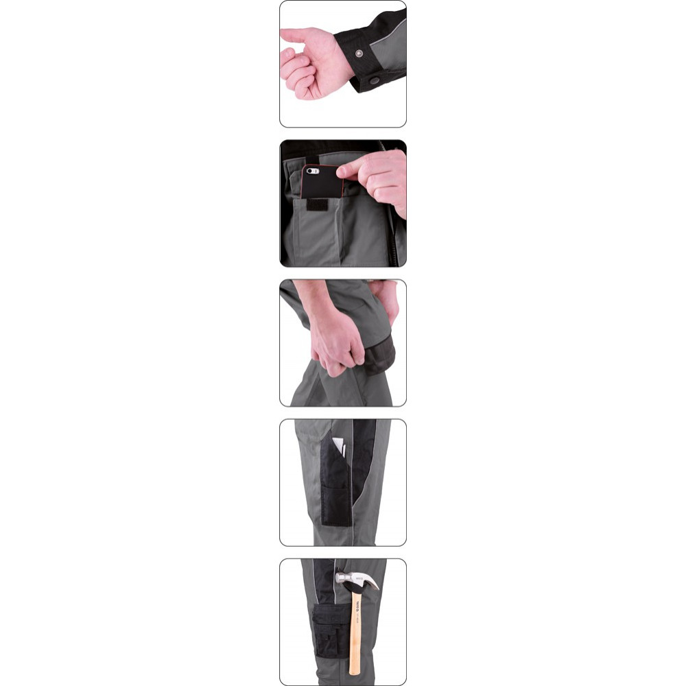 Комбинезон имеет удобный крой, не сковывающий движений, изготовлен из плотного материала на основе хлопка (35%) и полиэстера (65%). Материал гарантирует надежную защиту от истирания и влияния негативных внешних факторов. Усиленные накладки в области колен позволяют снизить нагрузку и защитить ноги от механических воздействий во время работы в неудобном положении. Есть возможность вставить наколенники.