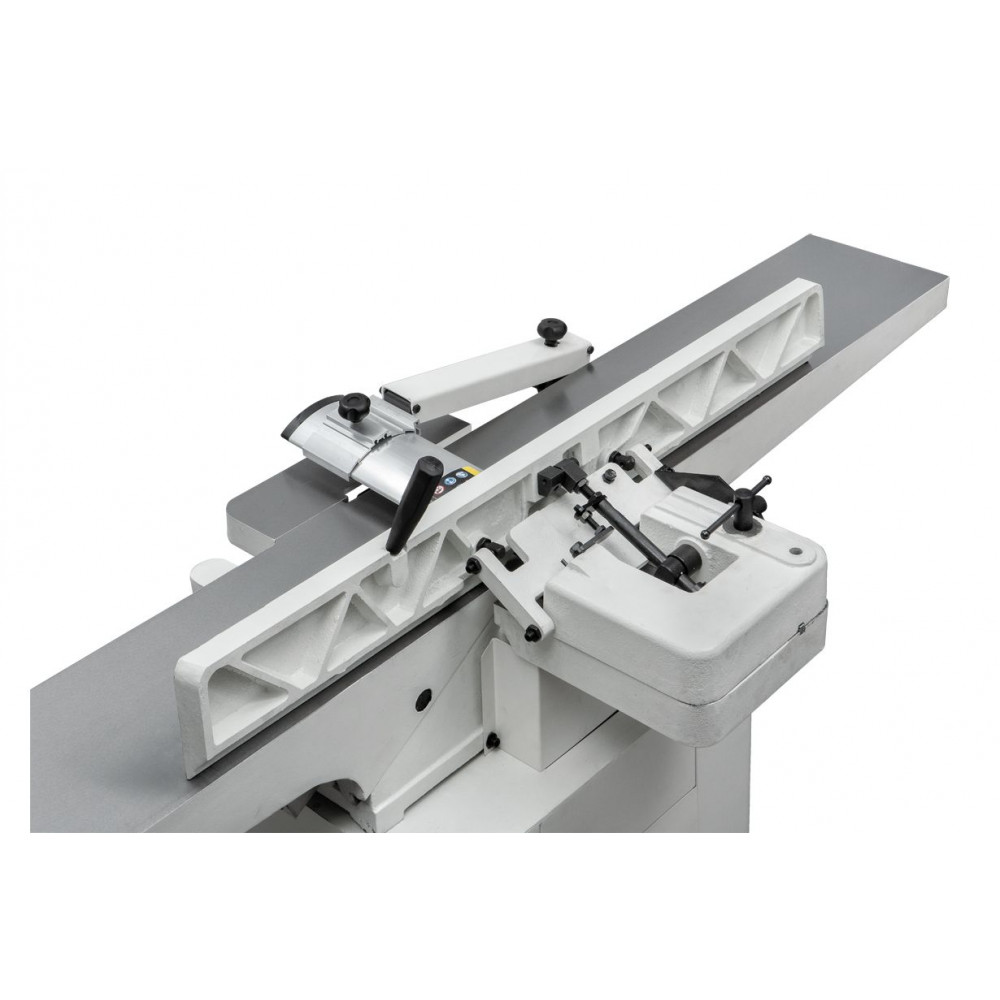 JJ-8L-M - фуговальный станок с длинными чугунными столами и шириной строгания 200 мм. Конструкция образована двумя частями. В нижней, она играет роль тумбы-подставки, однофазный асинхронный мотор и кожух сбора стружки со 100-миллиметровым аспирационным патрубком. В верхней чугунные рабочие столы, защитный кожух, упор заготовки и чугунное основание, где размещен строгальный вал.
