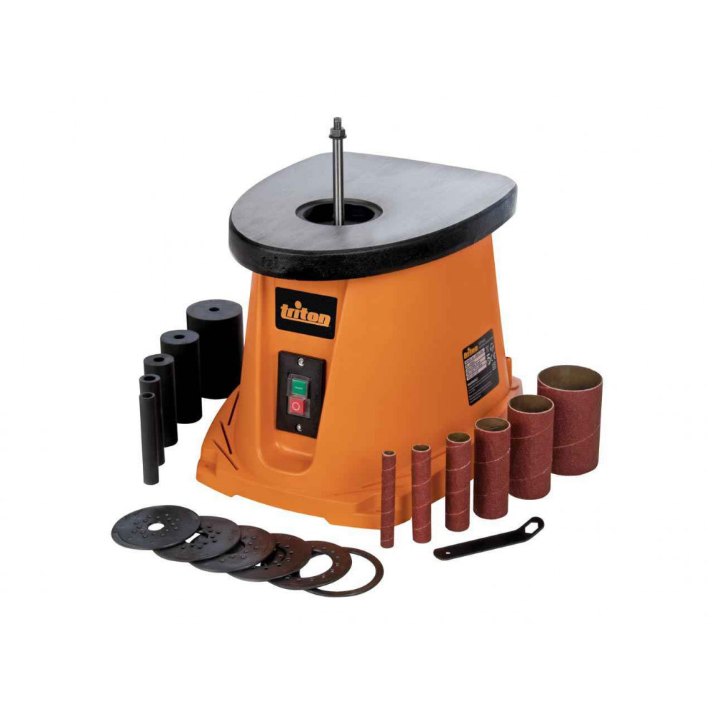 Главное достоинство осцилляционного шпиндельного шлифовального станка Triton TSPS450 – компактность и удобство при транспортировке и хранении. Станок предназначен для шлифования кромок деревянных заготовок. Основной элемент оборудования – абразивная гильза, совершающая вращательно-колебательные движения. Абразивную гильзу устанавливают на сменный шпиндель, представляющий из себя резиновую втулку. Оснастку выбирают в зависимости от необходимой зернистости и минимального радиуса закругления обрабатываемой детали. Диаметры гильз составляют 13-76 мм. В комплект входит их полный набор с зернистостью 80G, в качестве принадлежности доступны и другие марки абразива: от 60 до 150G – то есть для всех возможных случаев.