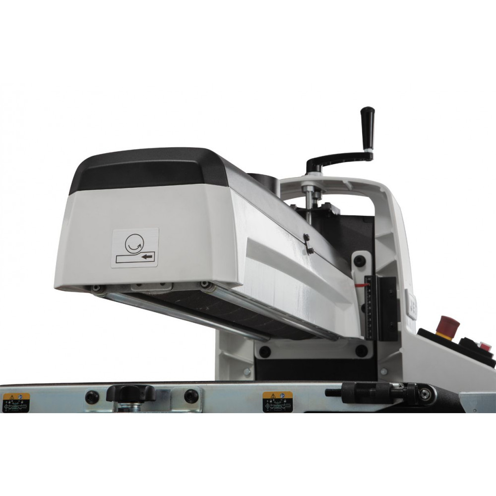 Рабочей оснасткой для данной модели является абразивная лента: наматывается на барабан, концы фиксируются специальными защелками. Пружинное устройство гарантирует правильное натяжение, а также компенсирует растяжение материала при износе. Предусмотрена вращающаяся рукоятка с одновременным контролем по миллиметровой шкале для регулировки высоты расположения узла. Упрощению настройки способствует регулируемый винтовой упор, а также для удобства можно приобрести устройство цифровой индикации высоты положения барабана. Регулировка параллельности расположения основания (отсутствие «клина») выполняется без использования дополнительных инструментов.