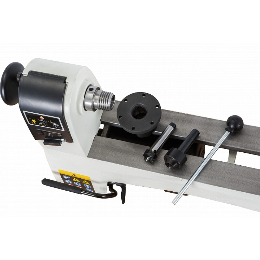 Станок оборудован асинхронным мотором, который работает с неизменной частотой вращения (1400 об/мин). Для выбора скорости шпинделя заменяют состояние поликлинового ремня (предусмотрено 6 пар шкивов). Данная операция занимает минимальное количество времени и выполняется без применения запасных инструментов. Срок службы станка гарантирован благодаря малогабаритной и отлично продуманной конструкции. Она делает данную модель совершенной для профессиональной и любительской работы с небольшими заготовками, такими как мебельная фурнитура, декорации, блюдца, маленькие чаши и т.п.