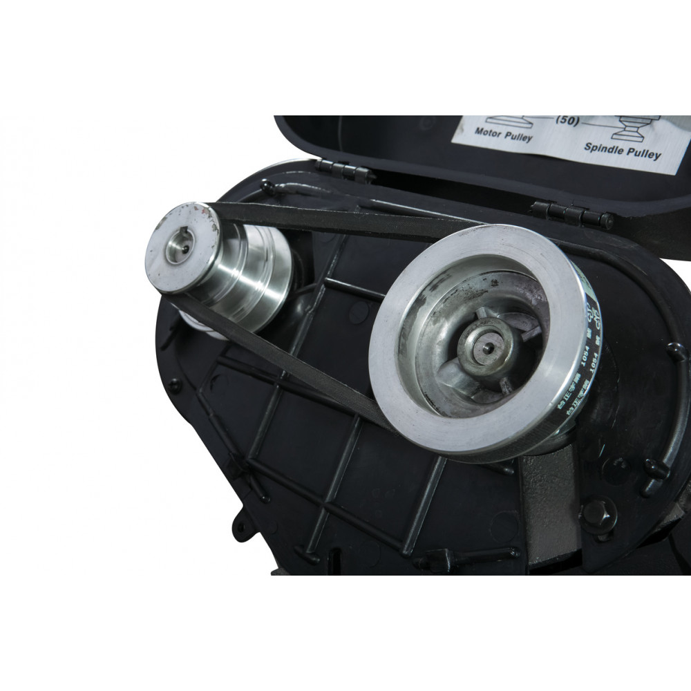 Производитель гарантирует продолжительный срок эксплуатации электродвигателя мощностью 650 Вт. Станок оснащен ременным приводом, благодаря которому можно устанавливать нужный вам скоростной режим: 20, 30 и 50 м/мин. Моторная группа имеет систему воздушного охлаждения. Регулируют позиционирование полотна при пилении заготовок разного диаметра направляющие, которые установлены на раме станка. Сокращение расстояния между направляющими уменьшает увод полотна.