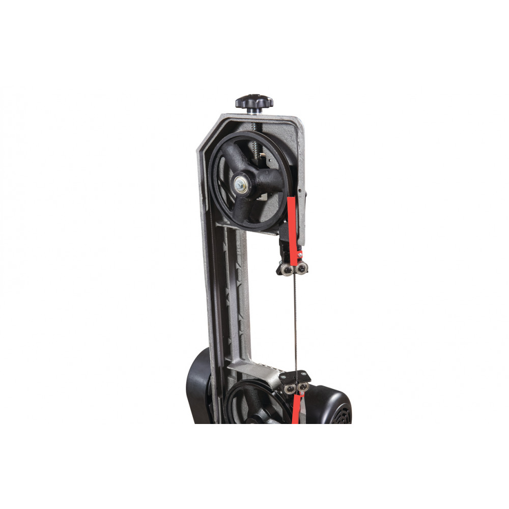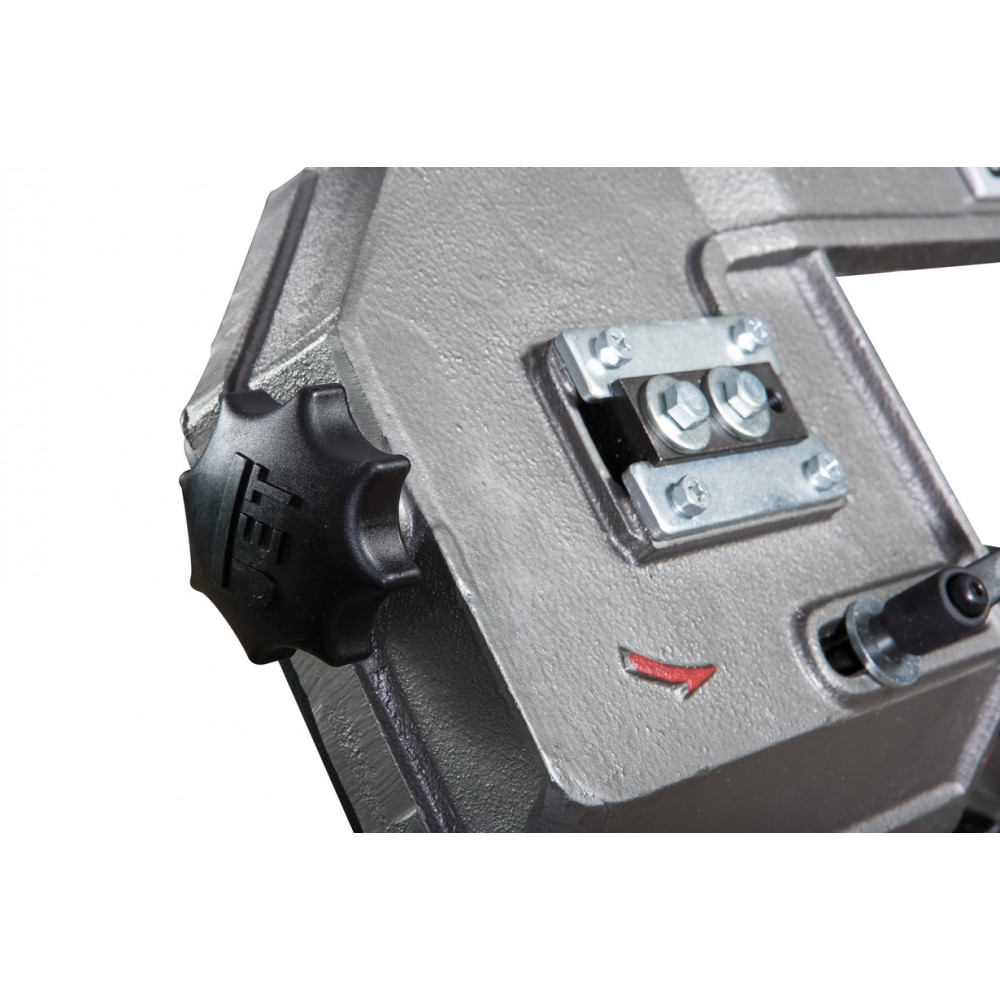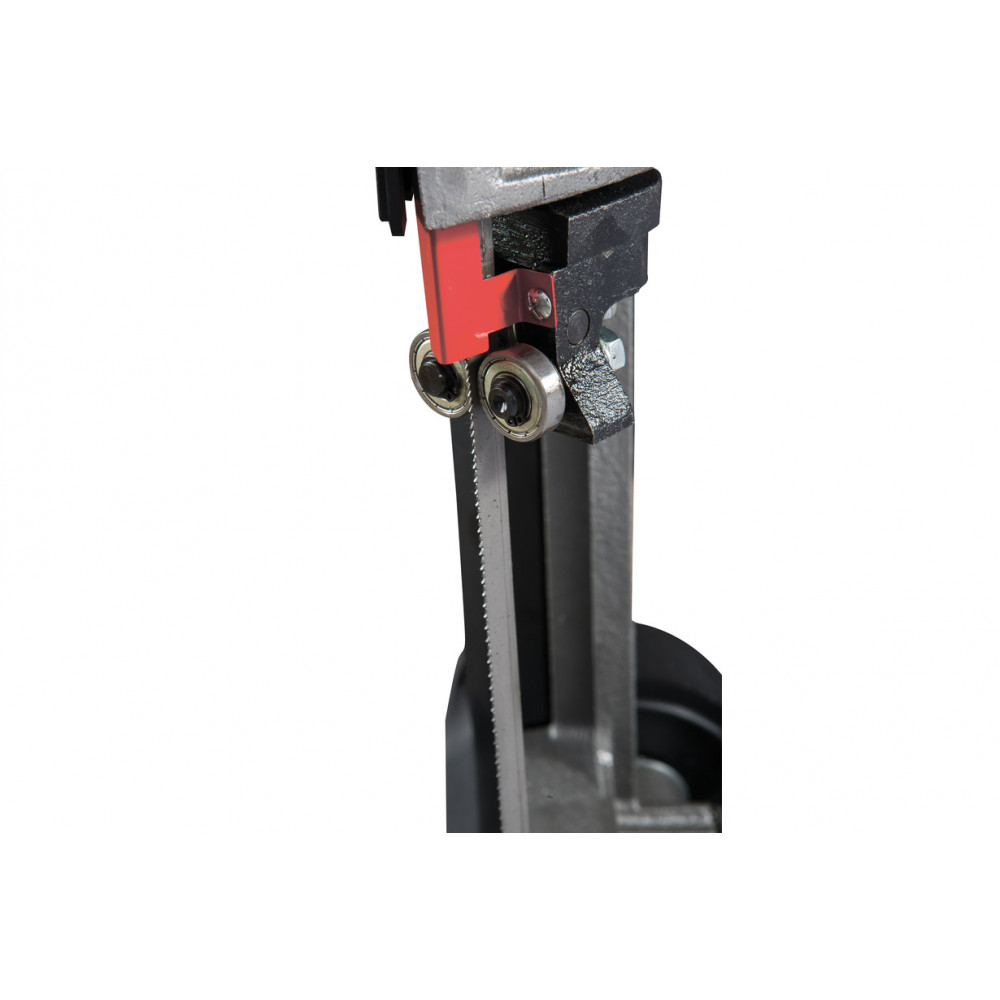 Благодаря подшипникам достигается максимальная точность распила, плюс ко всему они гарантируют постоянное перпендикулярное положение полотна по отношению к заготовке в процессе распила. Отрегулировать натяжение полотна можно вручную, в этом вам поможет маховик, расположенный в торцевой части станочной рамы. Чтобы закрепить заготовки используют механические тиски, а для установки их в необходимом вам положении предусмотрен концевой упор. Вручную также осуществляется подача охлаждающей и смазывающей жидкости.