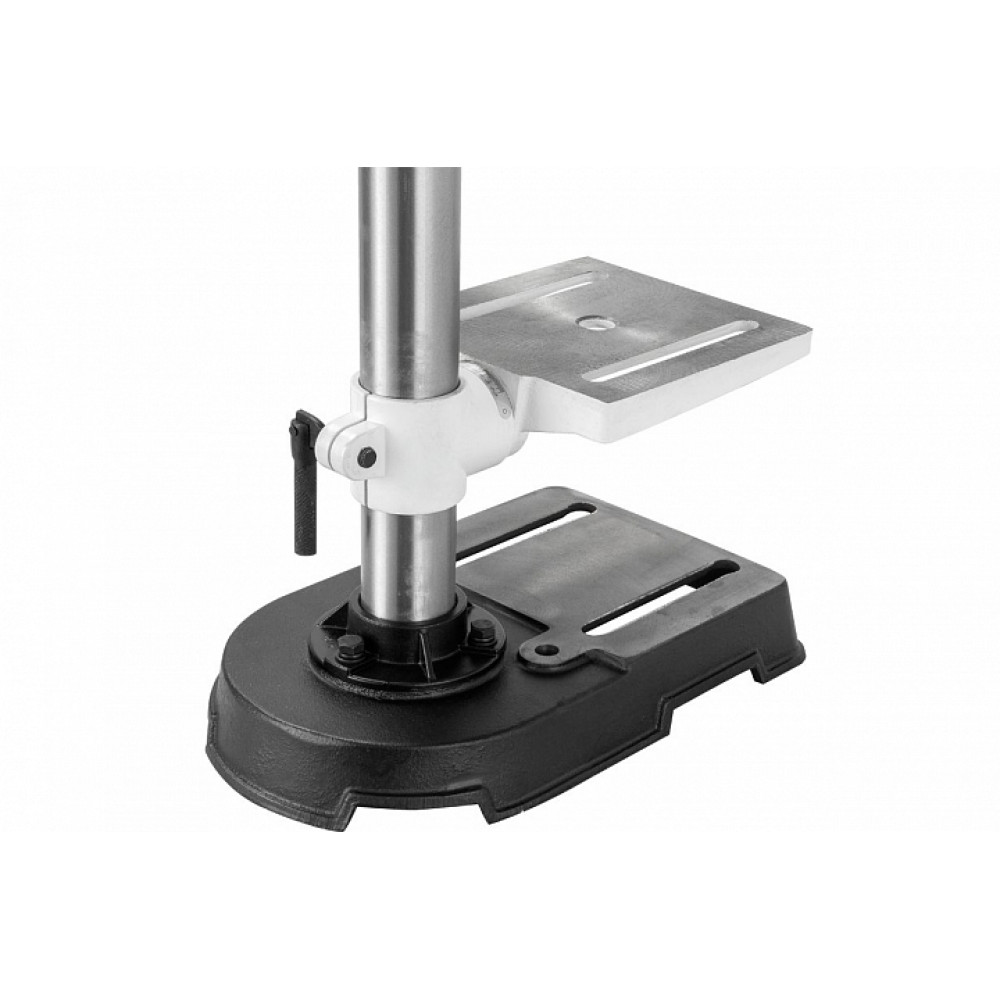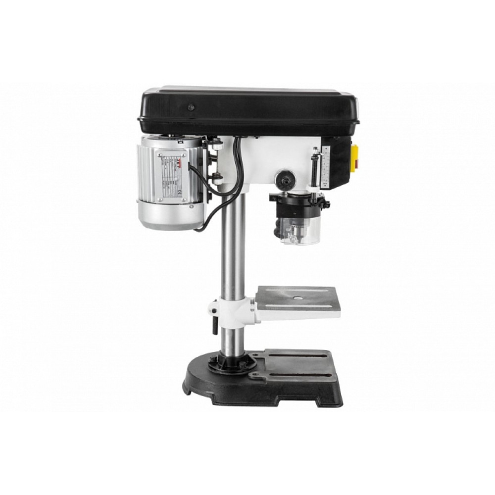 В сверлильной части установлен асинхронный однофазный двигатель и одноступенчатый (с одним ремнем) пятискоростной ременной редуктор. Переустановкой ремня на шкивах меняется скорость вращения шпинделя. Шкивы сделаны из металла, что гарантирует длительный срок службы и страхует от поломок при небрежном пользовании. Настраиваемый ограничитель с гайкой-стопором и шкала с миллиметровой разметкой существуют для контроля подачи пиноли шпинделя. Шпиндель имеет конус МК-2, что дает возможность использовать не только штатный патрон с отправкой, но и широкий спектр другой стандартной оснастки: сверла с конусным хвостиком, цанговые зажимы и пр. В комплект входят также тиски для фиксации заготовок, которые можно установить на столе или основании.