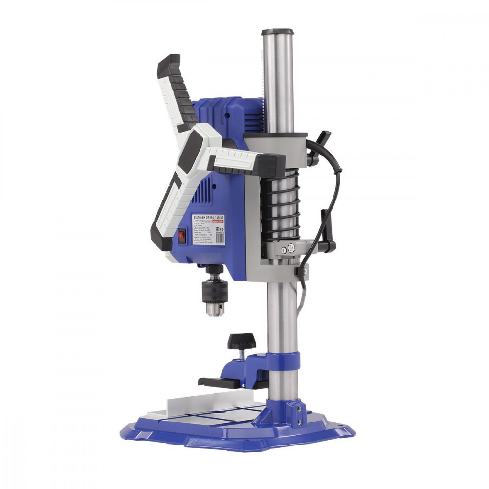 Все элементы управления расположены удобно для оператора. Рукоятка подачи позволяет плавно регулировать глубину сверления. Держатель для ключа исключает его потерю. Небольшой вес облегчает перемещение станка, а прочная конструкция обеспечивает устойчивость при работе.