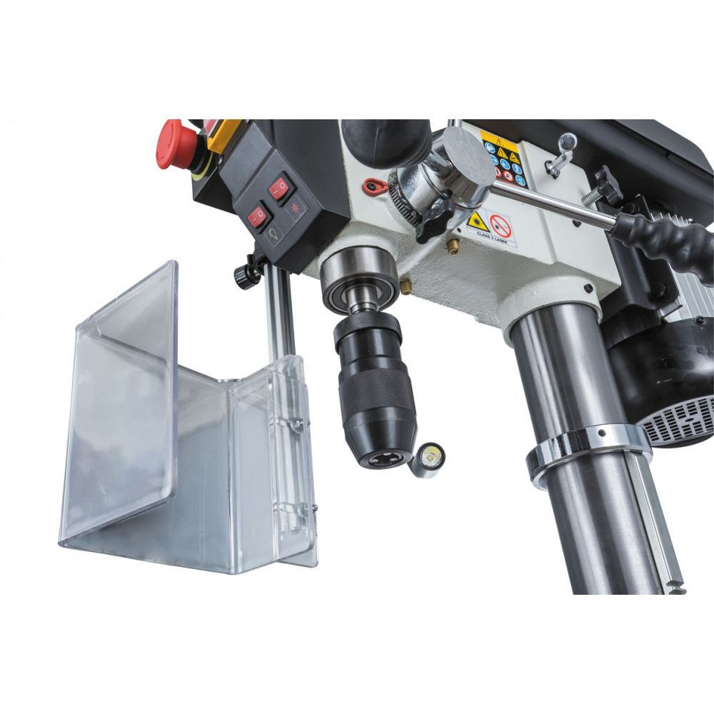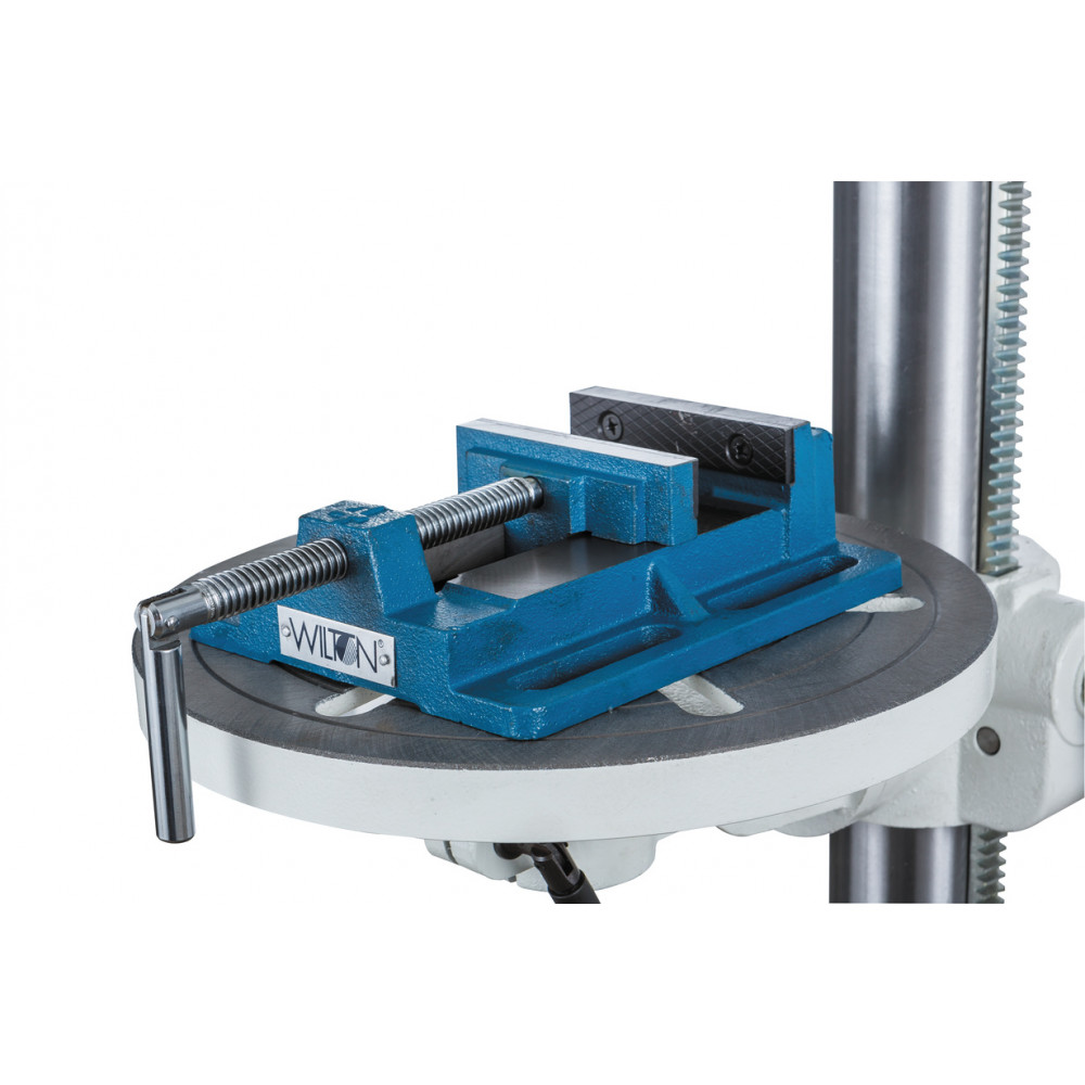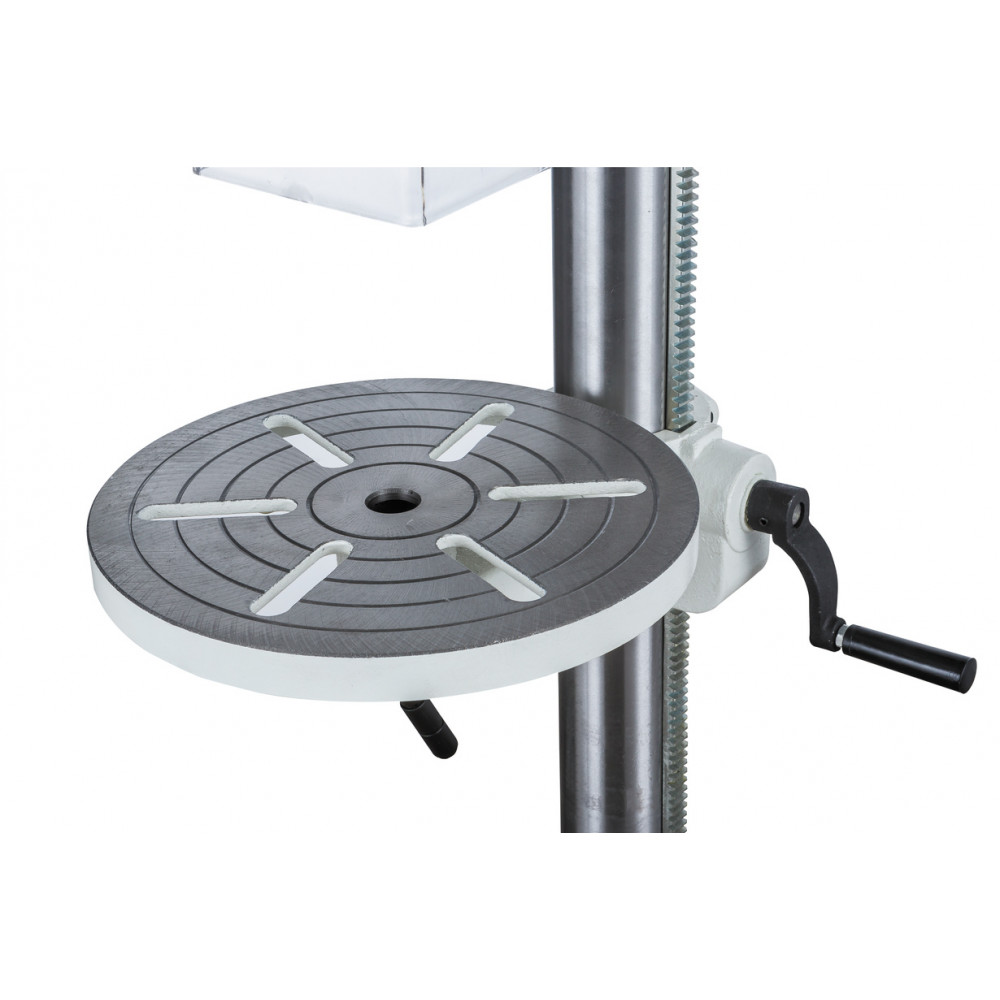 В форме круга массивный чугунный стол имеет радиальные прорези для установки тисков (поставляются в комплекте) и может вращаться вокруг своей оси. Поворотный кронштейн гарантирует наклон в обе стороны для сверления под углом и регулируется по высоте при помощи зубчато-реечного механизма. Рабочая зона с прорезями есть и на основании станка, что дает возможность работать от него, в таком случае расстояние до шпинделя будет достигать 1244 мм. Колонна, кронштейны, стол и иные образующие конструкцию детали выполнены массивно и прочно, с расчетом на большие усилия при подаче сверла.