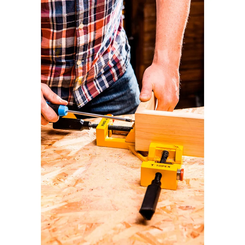 Струбцина угловая TOPEX облегчает крепление деталей, а также правильную сборку изделия. Алюминиевая, с губками, расположенными под прямым углом. Кнопка быстрой блокировки крепежного винта позволяет быстро сжимать и раскрывать губки без использования рукоятки.