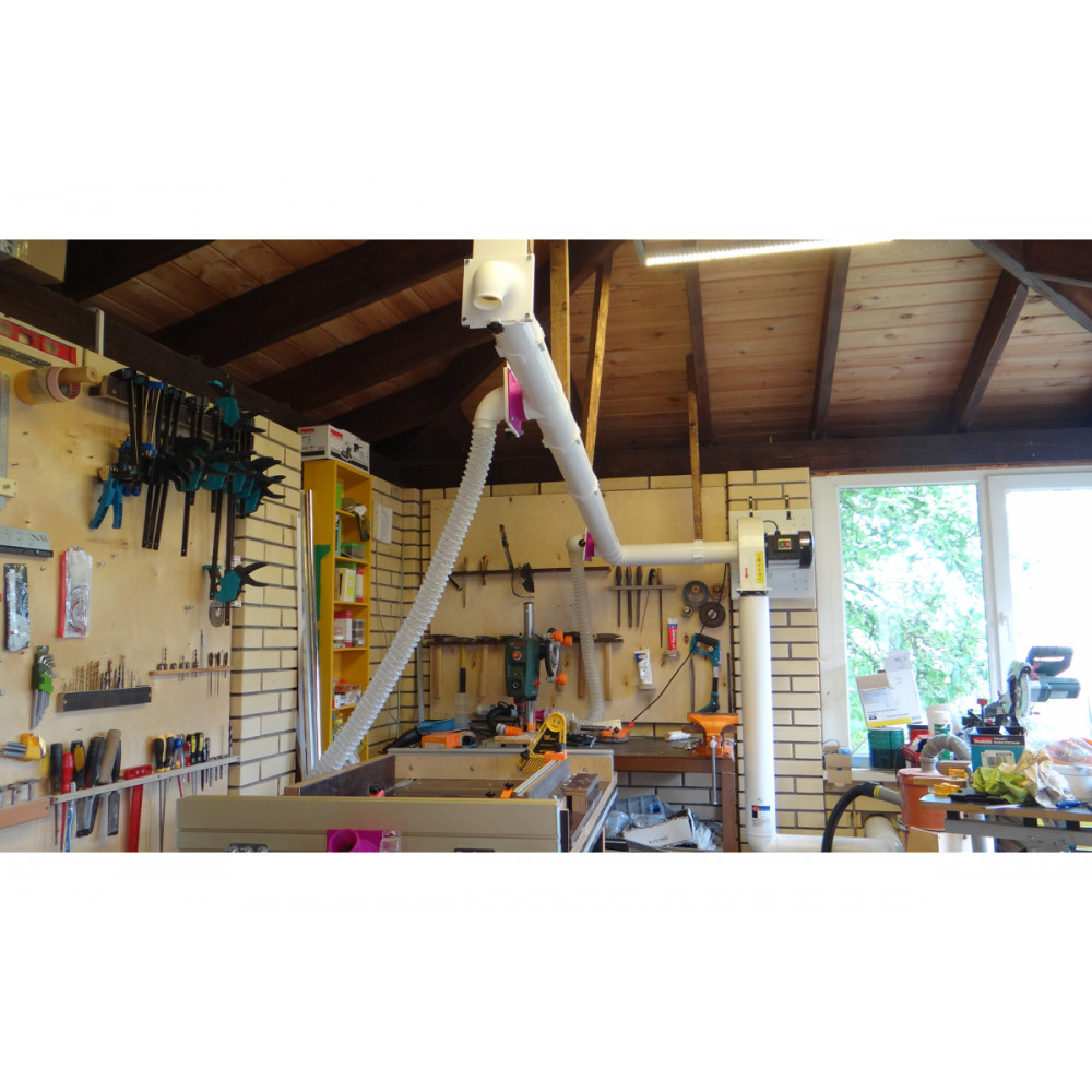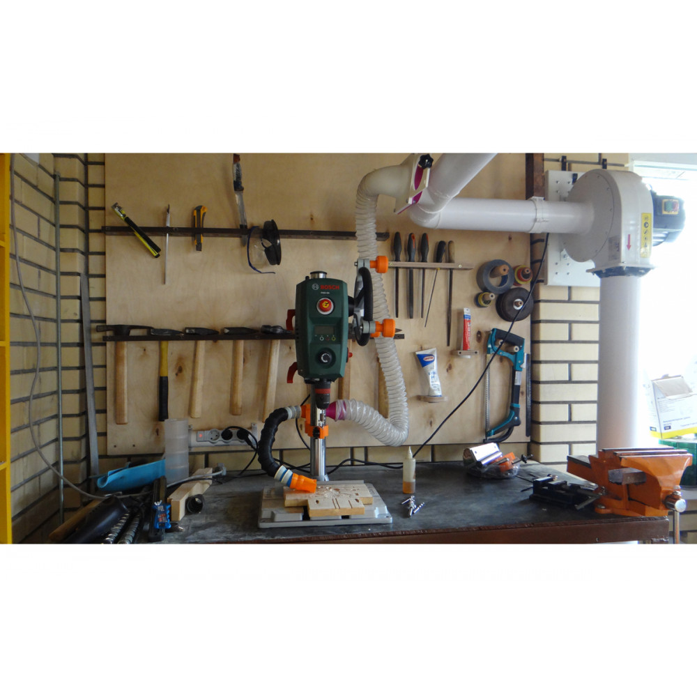 Шланг, через который без проблем проходит даже крупная стружка, опилки и шлифовальная пыль, подключается к 100-миллиметровому патрубку. 55-литровый мешок из плотной фильтрующей ткани служит накопителем. Сделанные из стали, «улитка» и крыльчатка такие же, как у стационарных установок.