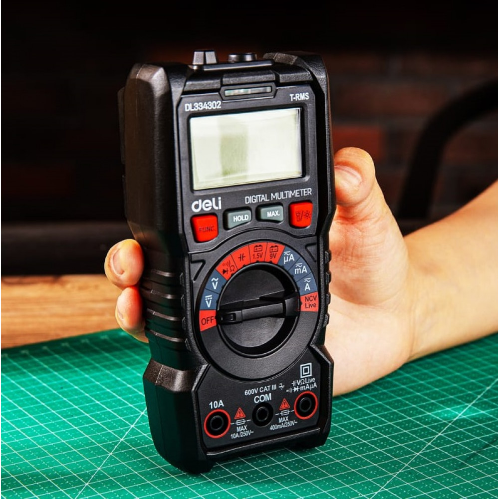 Универсальный цифровой мультиметр DL334302 от фирмы DELI - незаменимый инструмент для тех, кто занимается электротехническими работами или просто хочет контролировать состояние своей домашней электросети. Этот прибор позволяет измерять постоянное и переменное напряжение, постоянный и переменный ток, сопротивление цепи, емкость и многие другие параметры.