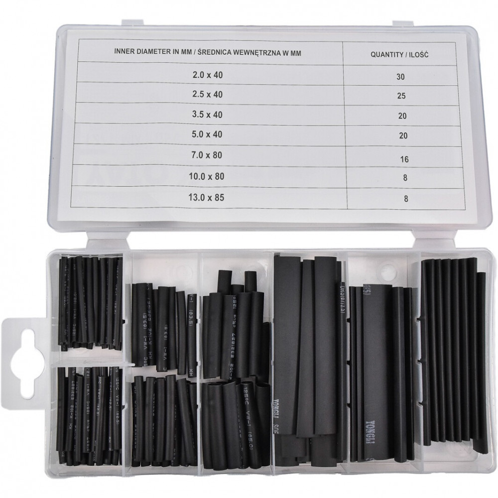 Набор YT-06866 включает в себя различные трубки длиной 40, 80 и 85мм с диаметрами от 2 до 13мм. Такое разнообразие обеспечивает эффективную работу с большим диапазоном различных электрических кабелей. Температура усаживания - 125 градусов.
