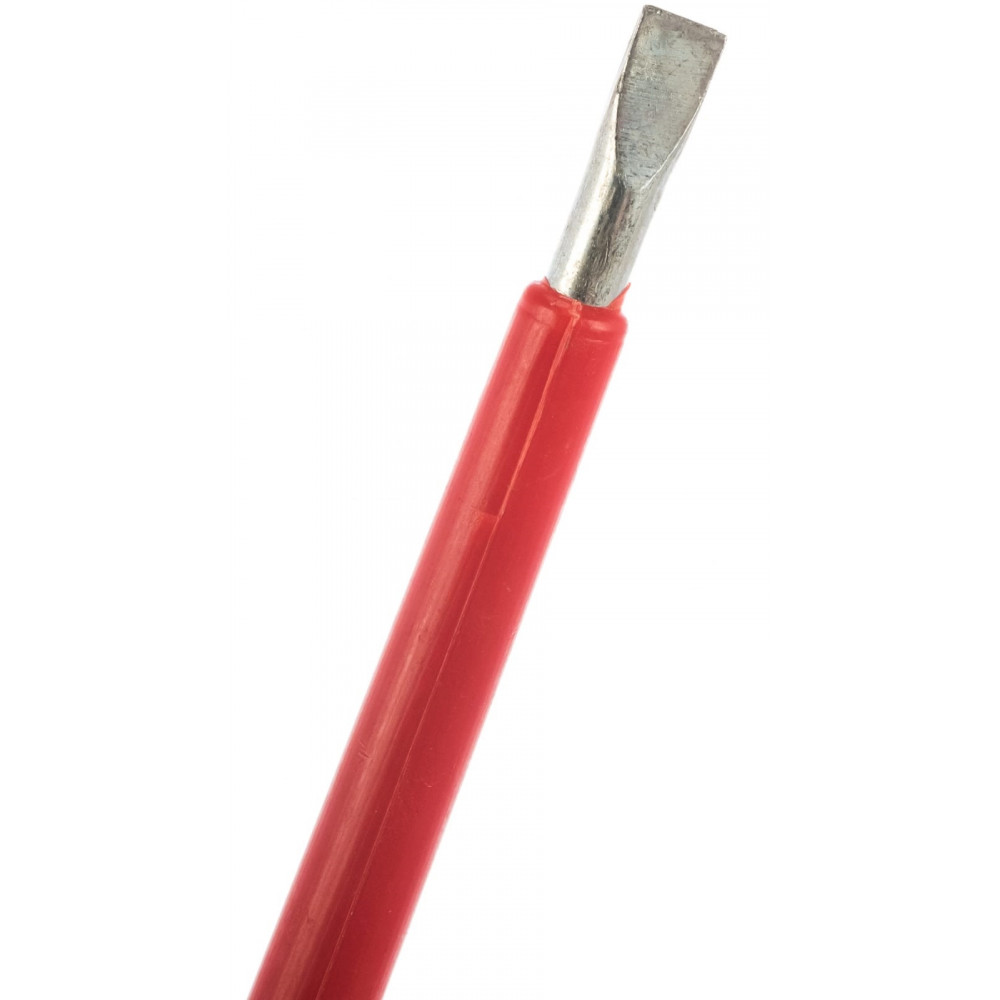 Отвёртка диэлектрическая плоская 0,6х4,0 мм НИЗ предназначена для работы в электроустановках напряжением до 1000В переменного и 1500В постоянного тока. Стержни отверток изготовлены из закаленной инструментальной стали, рукоятки и защита стержня из ударопрочного полистирола красного цвета.