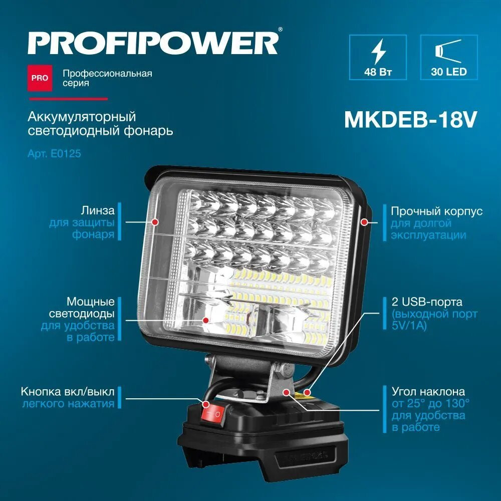 Фонарь работает от всех типов АКБ Profipower и Makita Li-on на 18 В, которые не входят в комплект поставки.