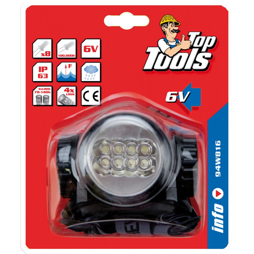 Налобный фонарь Top Tools (арт. 94W816) прекрасно подойдет для использования дома, в автомобиле, в турпоходах. Питание от четырех батарей AA. Фонарь налобный 8 x LED, батареи 4 x AA, сертификат CE.