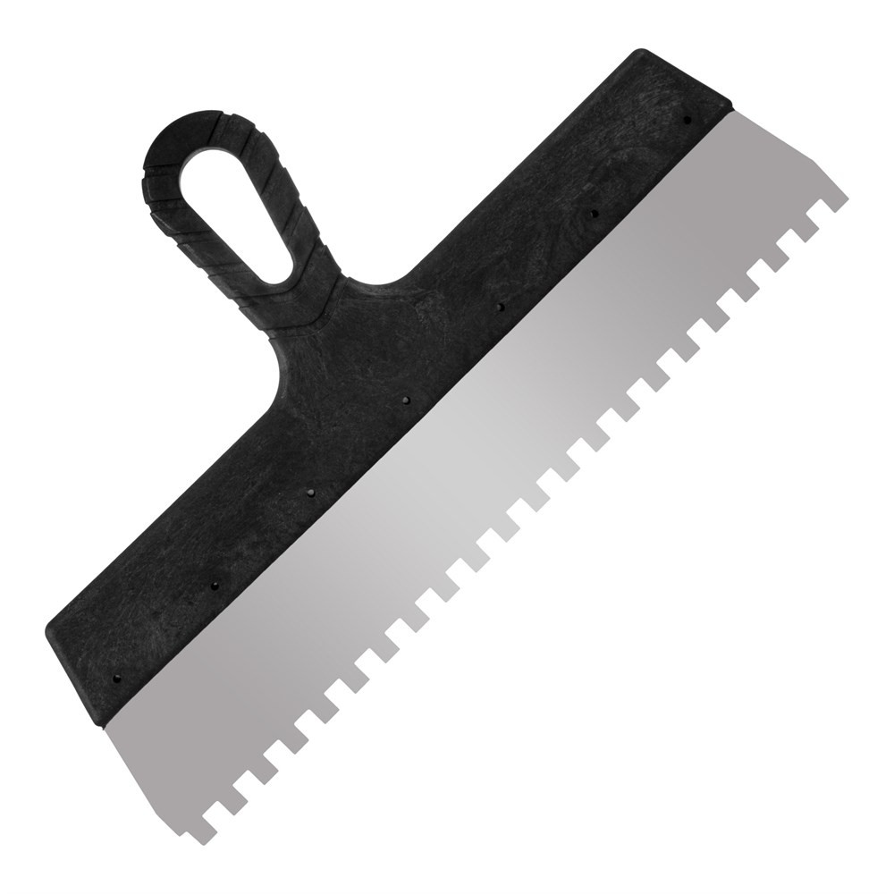 Зубчатый шпатель незаменим в процессе укладки керамической плитки, мозаики или стеновых панелей. Благодаря наличию зубцов такой инструмент обеспечивает равномерное нанесение клеящего состава на горизонтальные и вертикальные поверхности. Шпатель имеет полотно из прочной нержавеющей стали и эргономичную ручку, что гарантирует удобство использования.