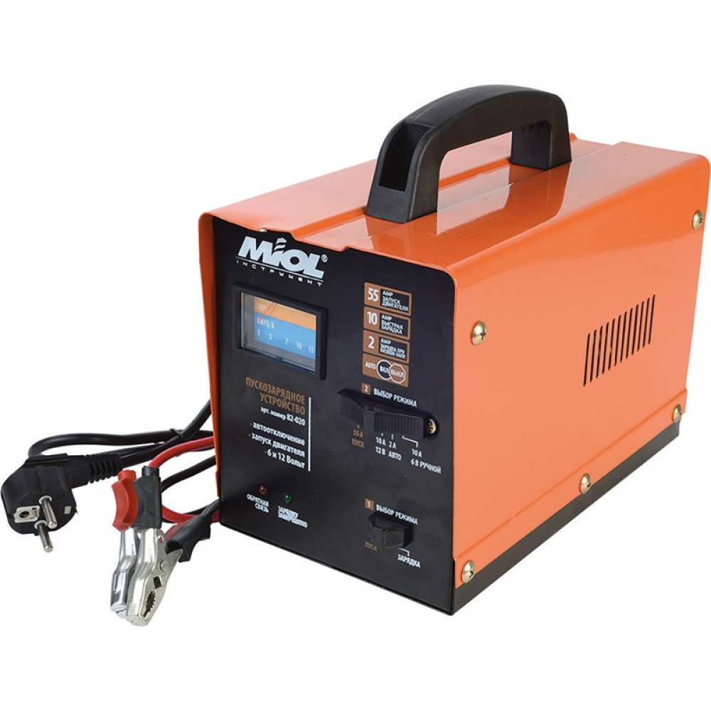 Пусковое зарядное устройство модели 82-020 от ТМ МИОЛ представляет собой специализированное приспособление, которое используется в качестве мобильной станции для экстренного запуска автомобильного двигателя в условиях разряженного аккумулятора. Это делает при помощи тока силой 55А. Кроме того, с помощью этого устройства можно заряжать батареи с объемом до 100А в час под напряжением 6В или 12В.