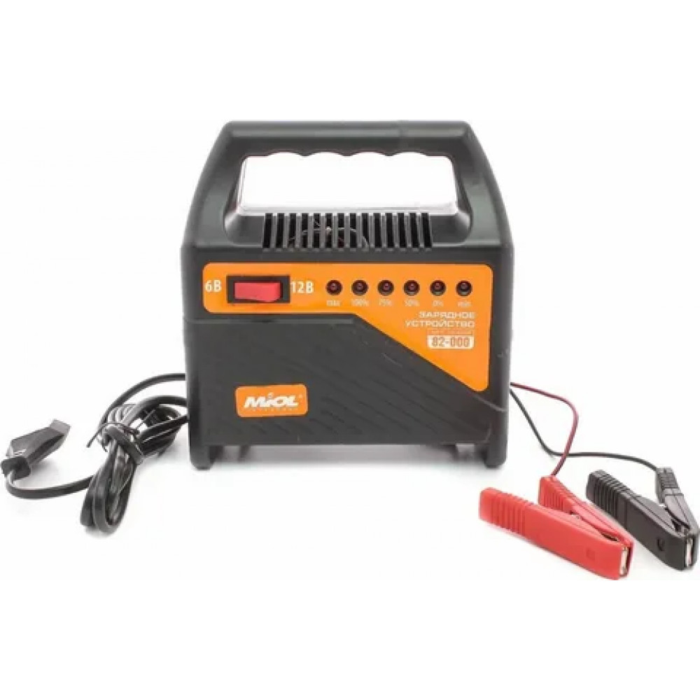 Зарядное устройство MIOL 82‑000 — бытовой прибор для зарядки кислотных АКБ напряжением 6 В и 12 В от сети 220 В. Отличается компактным корпусом из прочного пластика с вентиляционными отверстиями и светодиодной индикацией процесса зарядки. Обладает защитой от перегрева.
