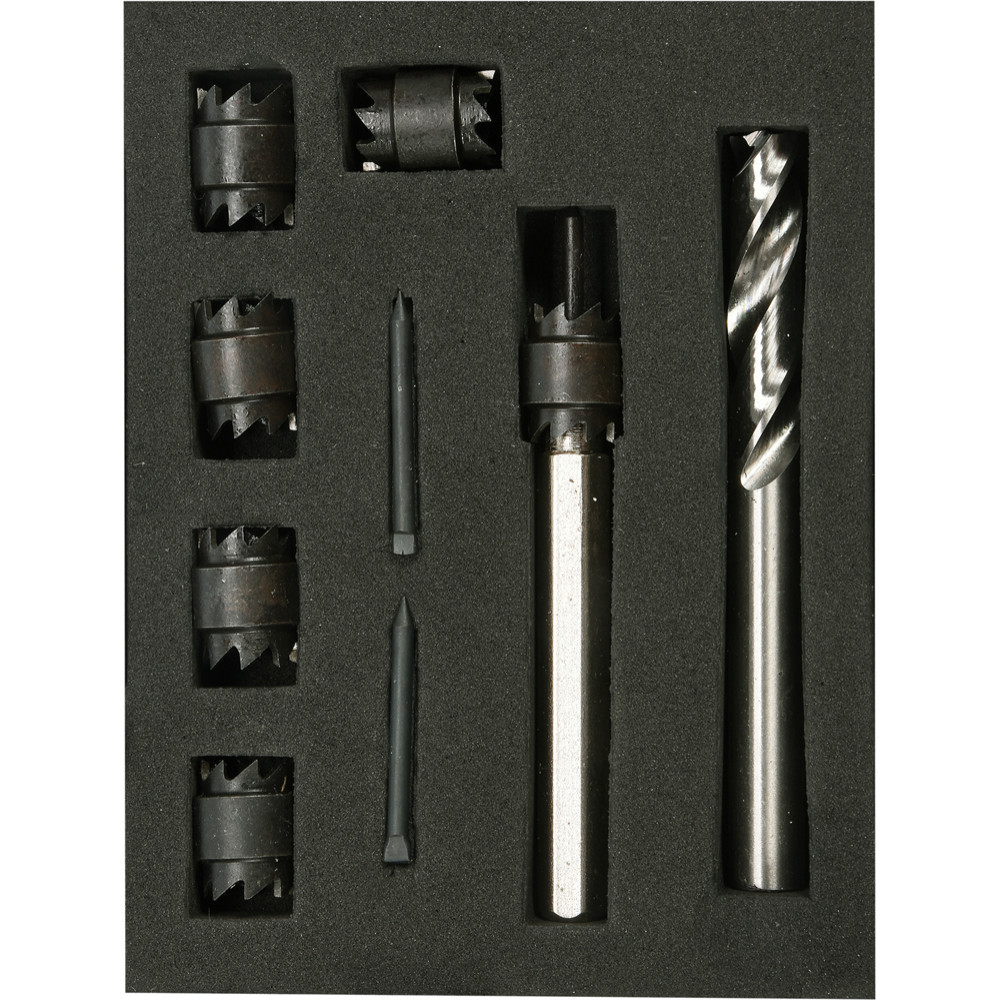 Данный набор применяется во время быстрого удаления различных швов и сварных соединений, в том числе для автомобильных кузовов. Набор состоит из 9 предметов, в том числе 6 двусторонних кружевных фрез, 3 сменных центровочных штифтов, фиксатора и сверла диаметром 10мм, изготовленным из качественной стали HSS. Это сверло используется для высверливания точечной сварки.