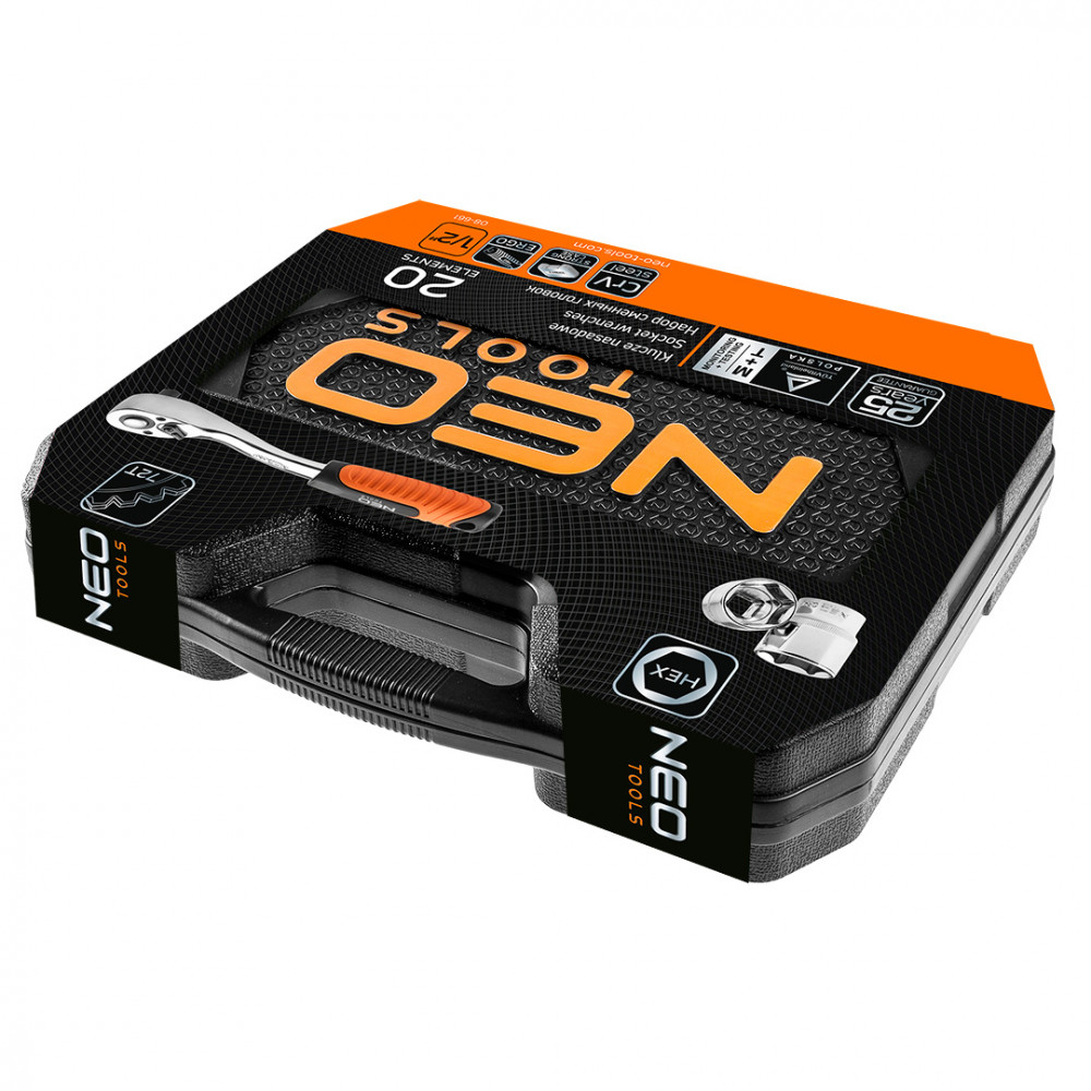 Набор сменных головок 1/2" NEO поставляется в удобном пластиковом чемоданчике, что позволяет всегда держать его под рукой. Комплект включает в себя 20 предметов. Материал изготовления инструментов – хромованадиевая сталь высочайшего качества. В наборе вы найдете трещотку с прочным храповым механизмом (72 зубцов), а также широкий выбор сменных головок (размеры от 10 до 24 мм). Кроме того, имеются удлинитель, шарнир, вороток и свечные головки. Надежность продукта подтверждает 25-летняя гарантия. Решитесь купить набор сменных головок 08-661 NEO и приобретете массу качественных и необходимых инструментов.
