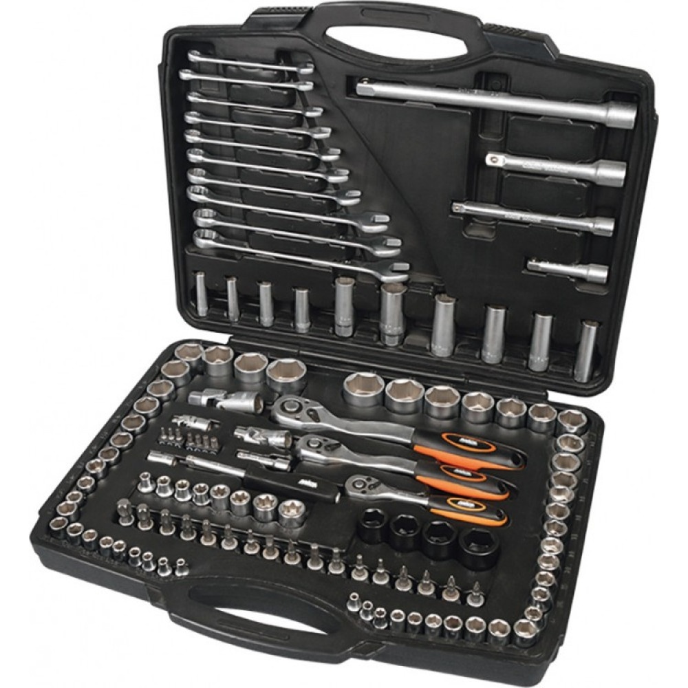 Полупрофессиональный комплект модели 58-070 от ТМ МИОЛ рассчитан на всестороннюю и эффективную работу со всеми известными видами крепежа и резьбовых соединений. Набор отлично подойдет для опытных автолюбителей для работы в бытовых условиях или в дороге. Полупрофессиональный комплект модели 58-070 от ТМ МИОЛ состоит из 120 предметов, которые идеально дополняют друг друга и обеспечивают успешную работу с любым крепежом. Все предметы выполнены из высококачественных материалов и отличаются большой долговечностью даже в условиях интенсивного использования. Набор можно применять в работе с большинством известных профилей 1/4, 3/8, 1/2 дюйма и включает в себя различные торцевые головки и насадки, а также специализированные приспособления для нормальной работы с ними: