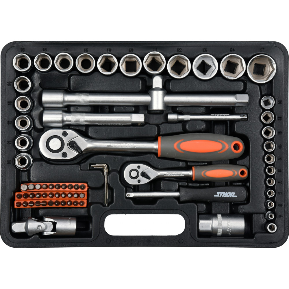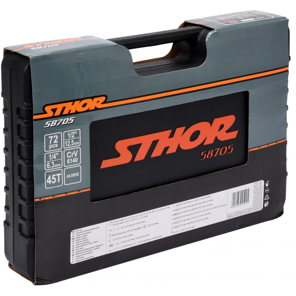 Набор инструментов STHOR состоит из 72 элементов, помещенных в удобный пластиковый кейс. Инструменты точно изготовлены из материалов, обеспечивающих их надежность. В комплект входит полный набор головок 1/4 "и 1/2", удлинителей, карданного шарнира и многих других элементов, в том числе трещоток с 45 зубьями. Такая конфигурация делает набор подходящим для небольших монтажных работ, механического ремонта и многих других работ по дому или в мастерской.