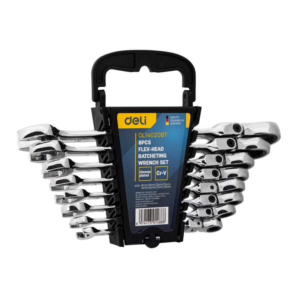Набор DL140208T ключей с трещоткой и шарниром 72 зуба 8шт, Deli