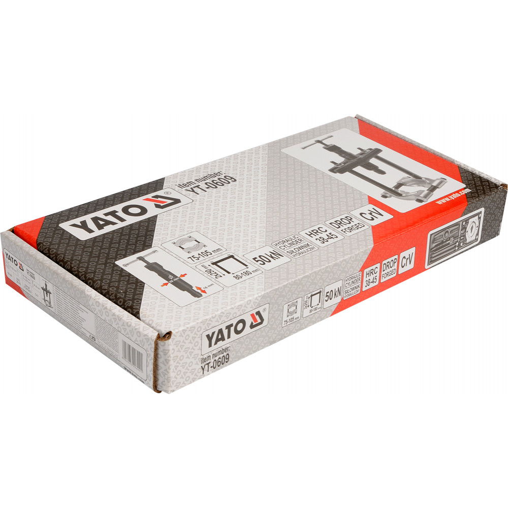 Захваты и элементы тянущей части гидравлического съемника YT-0609 изготовлены из высококачественной углеродистой стали, закаленной до 42-45 HRC. Длина съемника составляет 2х256мм, а диаметр равен 80-180 x 75-105мм. Съемник способен выдерживать давление равное 5 тоннам.