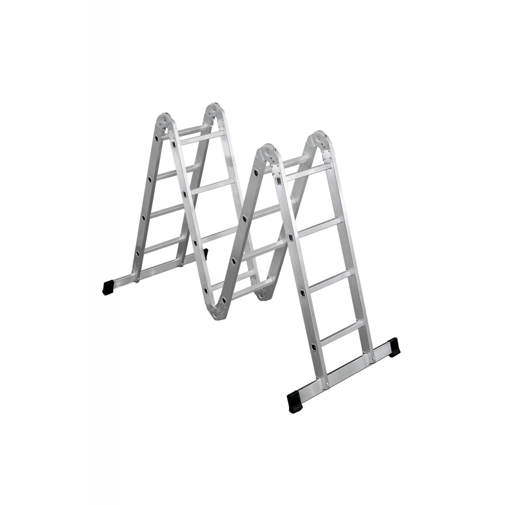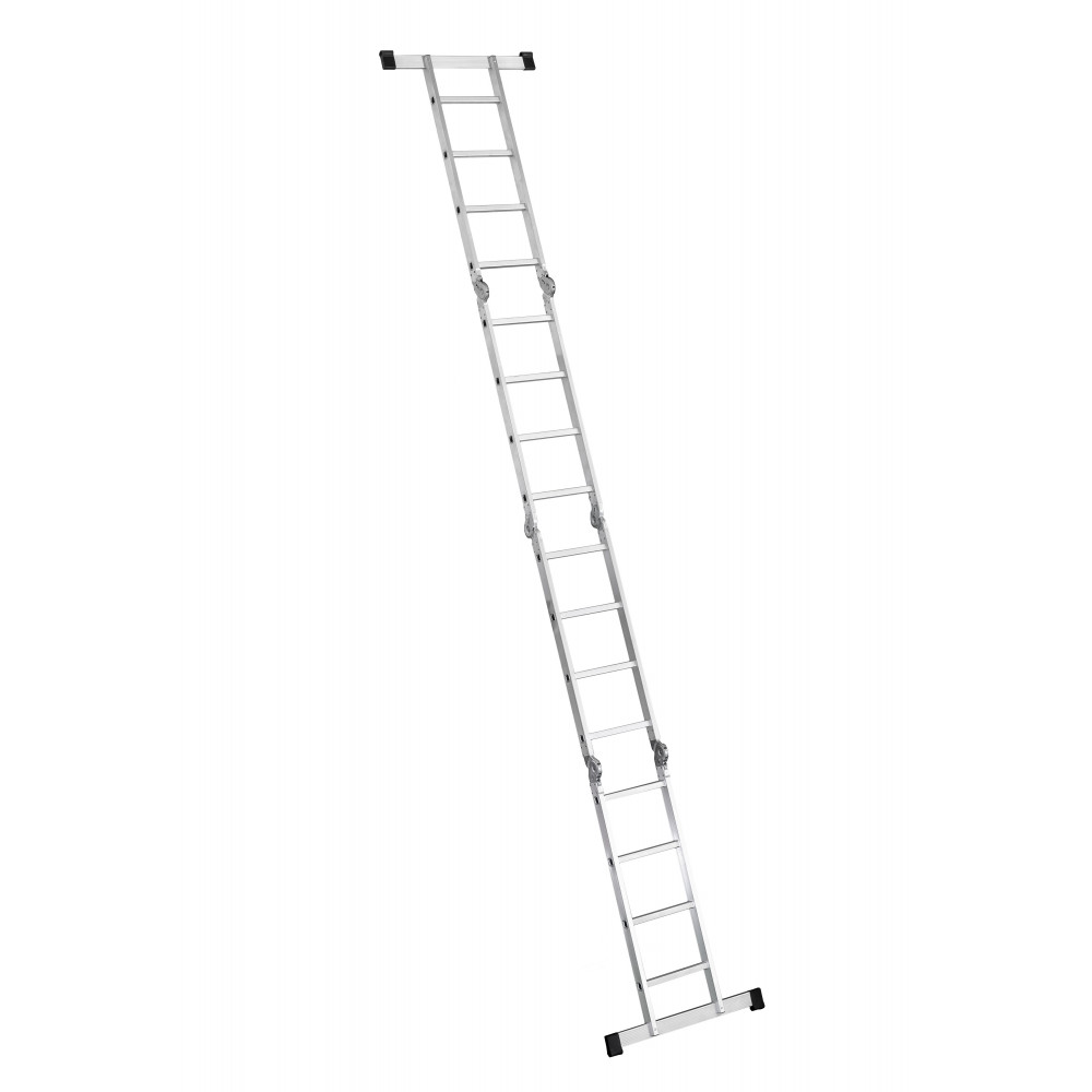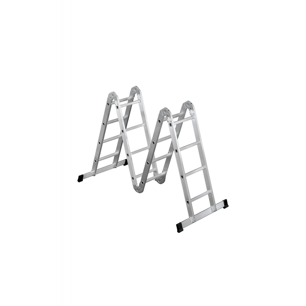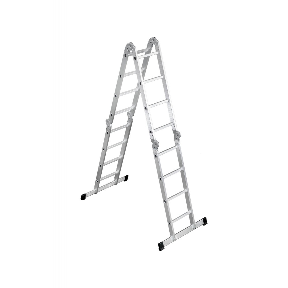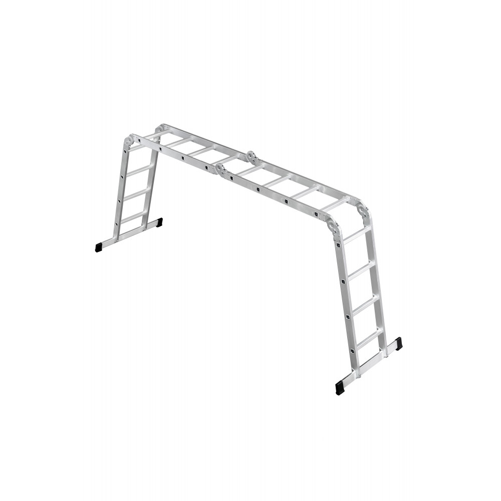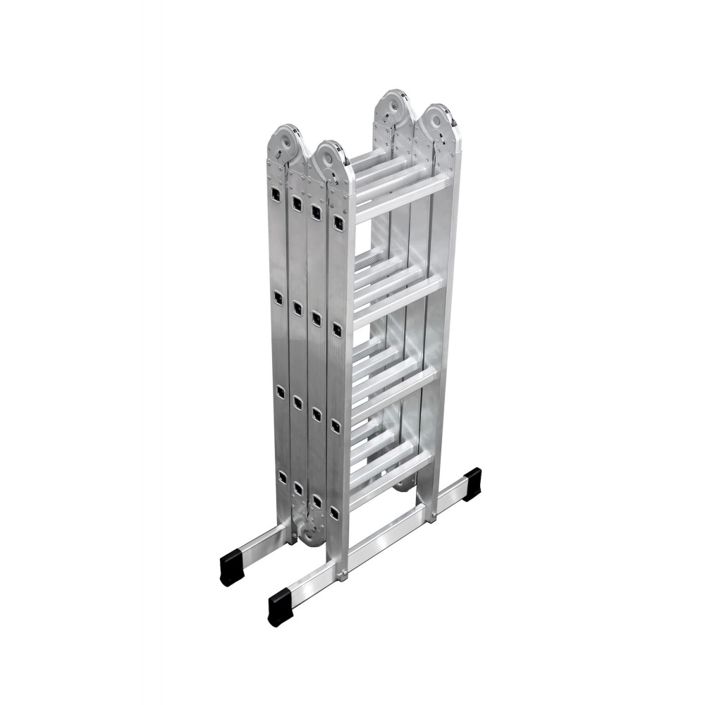 Трансформирующаяся лестница UFUK с четырьмя секциями по четыре ступени обладает особой конструкцией, которая позволяет использовать эту модель в нескольких формах, каждая из которых может пригодиться в той или иной ситуации в процессе проведения всевозможных строительно-монтажных работ. Данная лестница отличается тем, что каждая ее секция соединена с другими посредством специальных металлических шарниров, что дает возможность регулировать угол наклона секций и установить лестницу в разных режимах, например как: