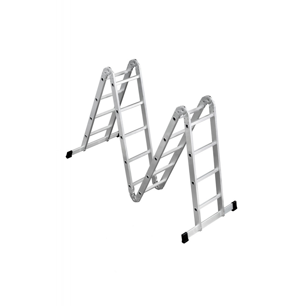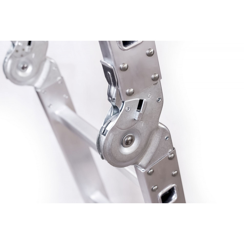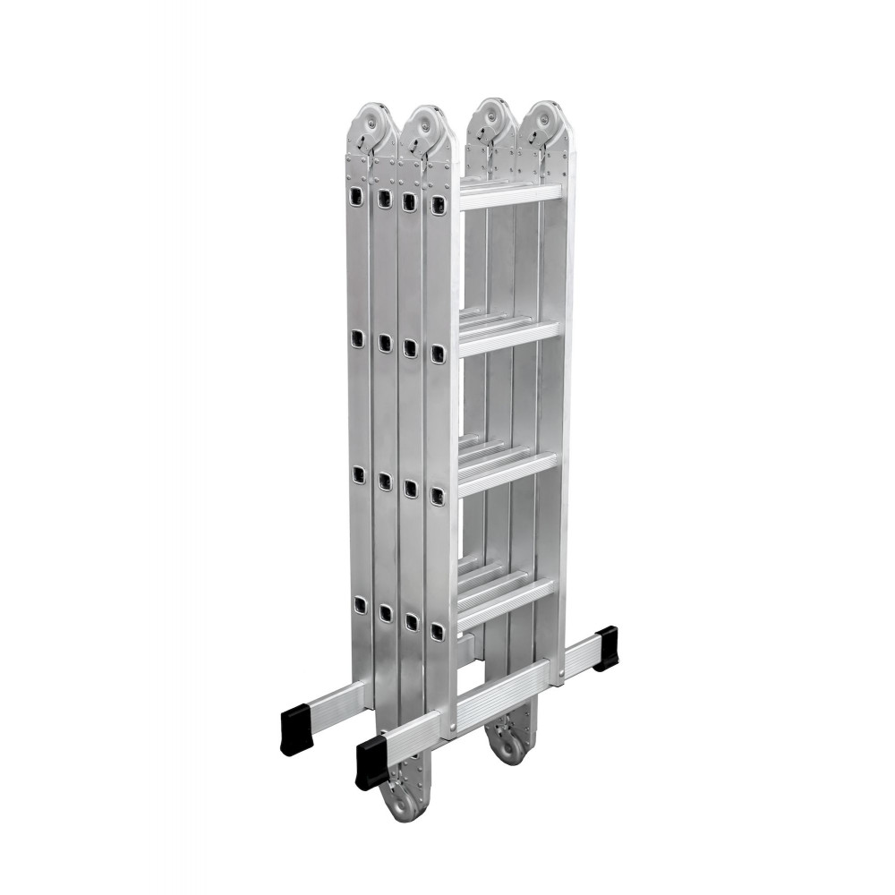 Трансформирующаяся лестница UFUK с четырьмя секциями выполнена из высококачественного алюминия, а ее профиль прямоугольной формы толщиной 1,45 мм отличается легкостью и прочностью, и может удерживать вес до 150 кг. Каждая секция имеет по шесть эргономичных ступеней, надежно соединенных с корпусом. Всю конструкцию можно легко и компактно сложить, чтобы экономить место для хранения, а также достаточно легко транспортировать. Лестница достаточно устойчива благодаря специальной перекладине (траверсе), которая позволяет распределить нагрузку на всю площадь, а особые накладки на ее концах обеспечивают защиту от скольжения.