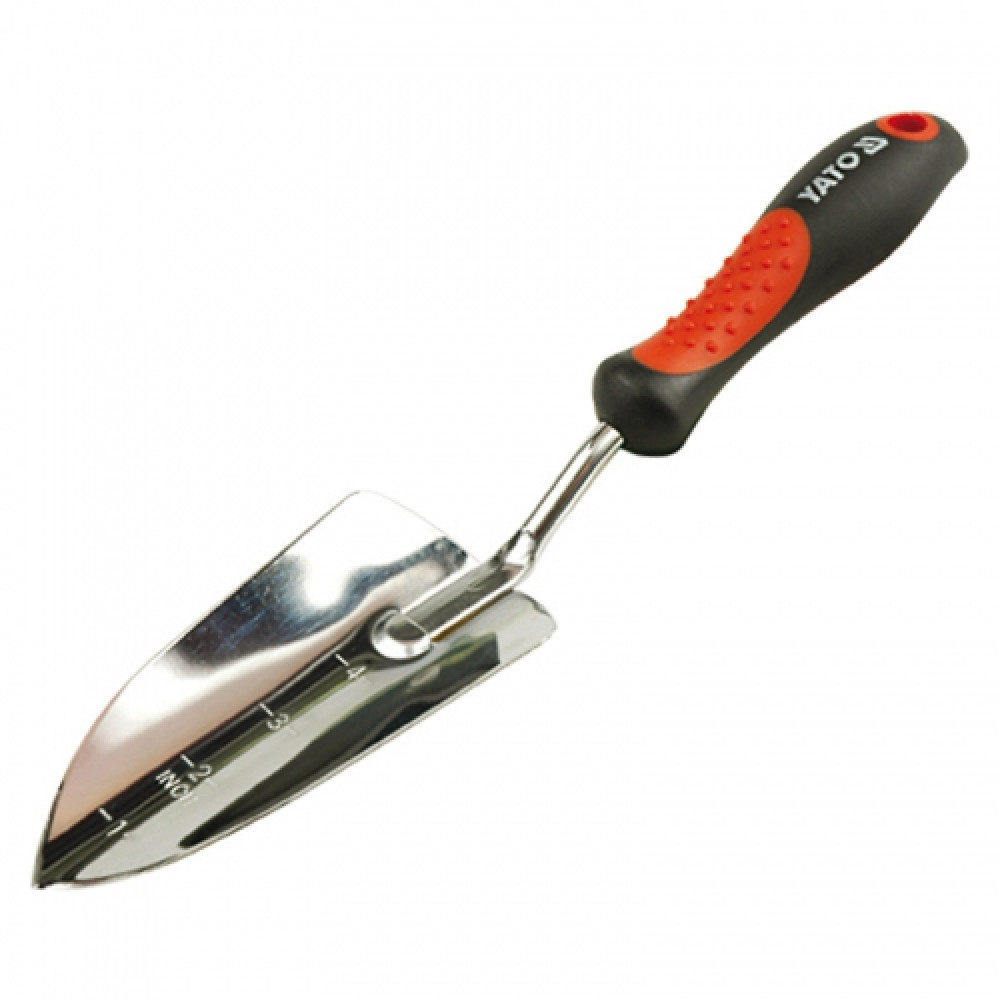 YT-8886 – это широкий хромированный посадочный совок от ТМ YATO. Изготовлен из стали, его длина составляет 340мм. Поверхность имеет покрытие, защищающее от коррозии. Ручка обладает удобной для работы формой и специальным покрытием для предотвращения скольжения, а также отверстием для подвеса.