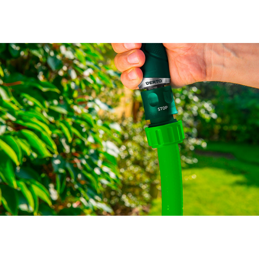 Муфта с автостопом 3/4" 15G723 от VERTO. Быстросъемная муфта изготовлена из высококачественной пластмассы, поэтому этот продукт будет бесперебойно работать в течение длительного времени. Дополнительным преимуществом быстросъемной муфты является автостоп, благодаря чему можно легко остановить подачу воды, и для этого не требуется перекрывать кран.