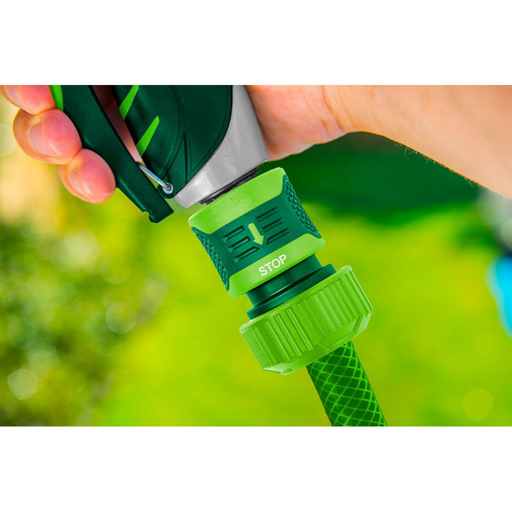 Муфта с автостопом 3/4" 15G733 от VERTO. Быстросъемная муфта изготовлена из высококачественной пластмассы, поэтому этот продукт будет бесперебойно работать в течение длительного времени. Ручка из антискользящей резины обеспечивает удобное обслуживание.