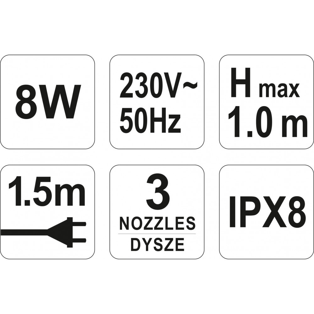 Фонтанный насос 79927 от FLO обладает очень надежной и практичной конструкцией, которая отличается большим сроком долговечности. Насос питается от сети с напряжением 220-240В при помощи кабеля длиной 10 метров, а его мощность составляет 16Вт при диаметре соединения 1дюйм. Данное устройство способно осуществлять подачу воды на высоту 1,3 метра при глубине погружения до 2 метров. Вес насоса равен 1,35 кг, а его скорость работы составляет 800 дм3 в час.