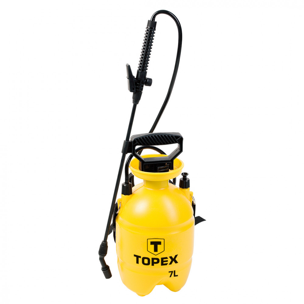 Опрыскиватель TOPEX. Широкое горлышко облегчает наполнение емкости. Дополнительный плечевой ремень позволяющий повесить опрыскиватель на плечо, а также фиксация струи повышают комфорт работы. Клапан обеспечивает безопасность при эксплуатации. Рабочее давление - 2.5 bar.