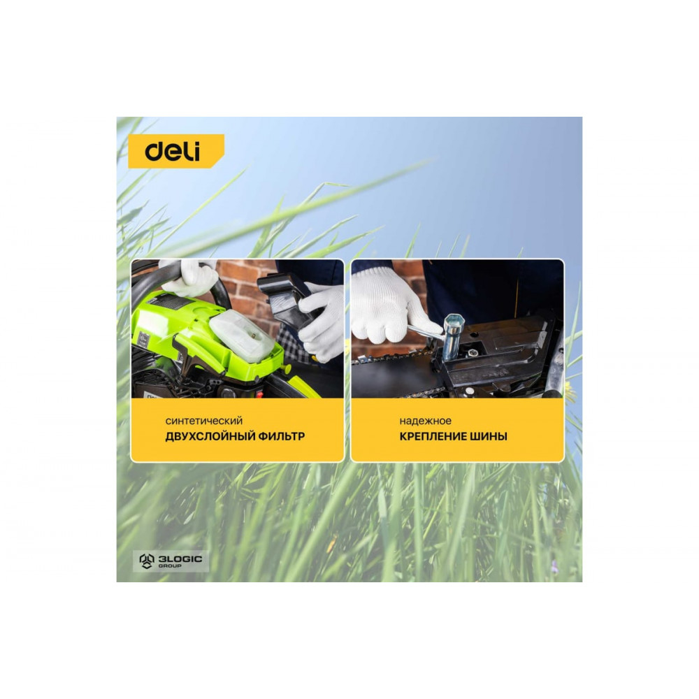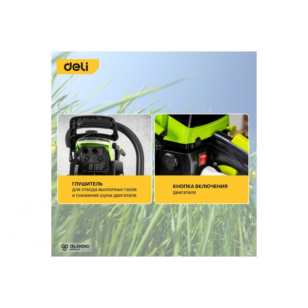 Модель также имеет множество удобных функций, таких как легкий запуск, антивибрационная система, автоматическая подача масла для смазки цепи, тормоз цепи для безопасности и комфортная рукоятка с прорезиненным покрытием. Бензопила DL585020 Deli - это надежный и качественный выбор для тех, кто занимается пилорамой, садоводством или строительством.