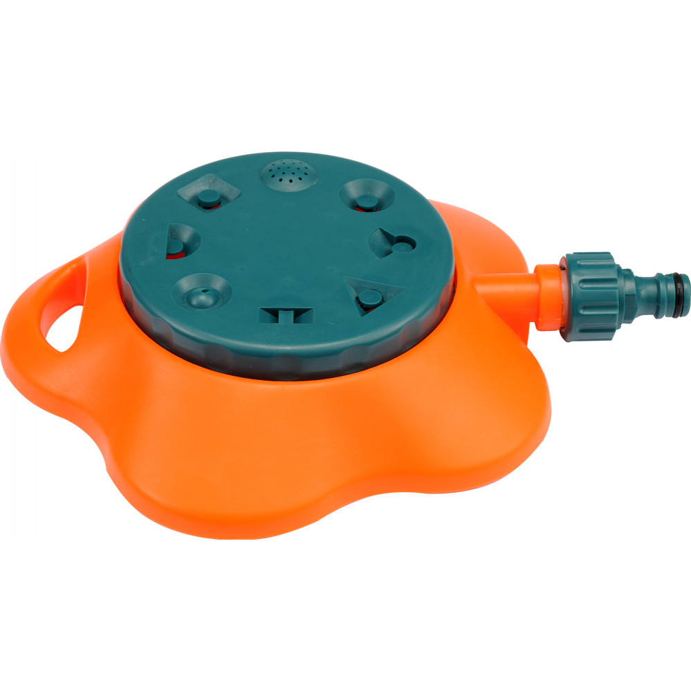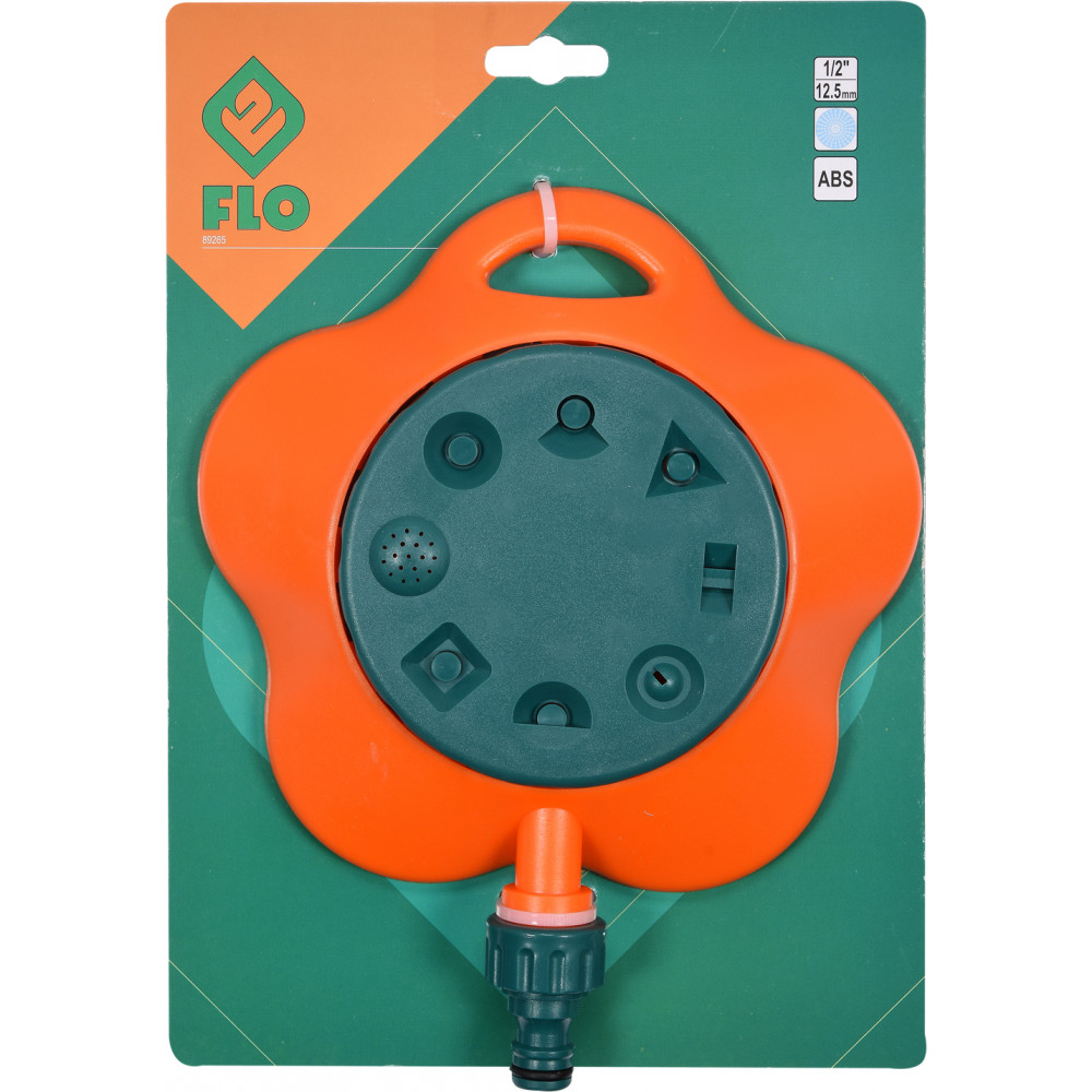 Дождеватель типа Цветок 89265 от FLO представляет собой специальный распылитель со штуцерной посадкой. Он размещен на специальной подставке и обладает восемью режимами для полива: