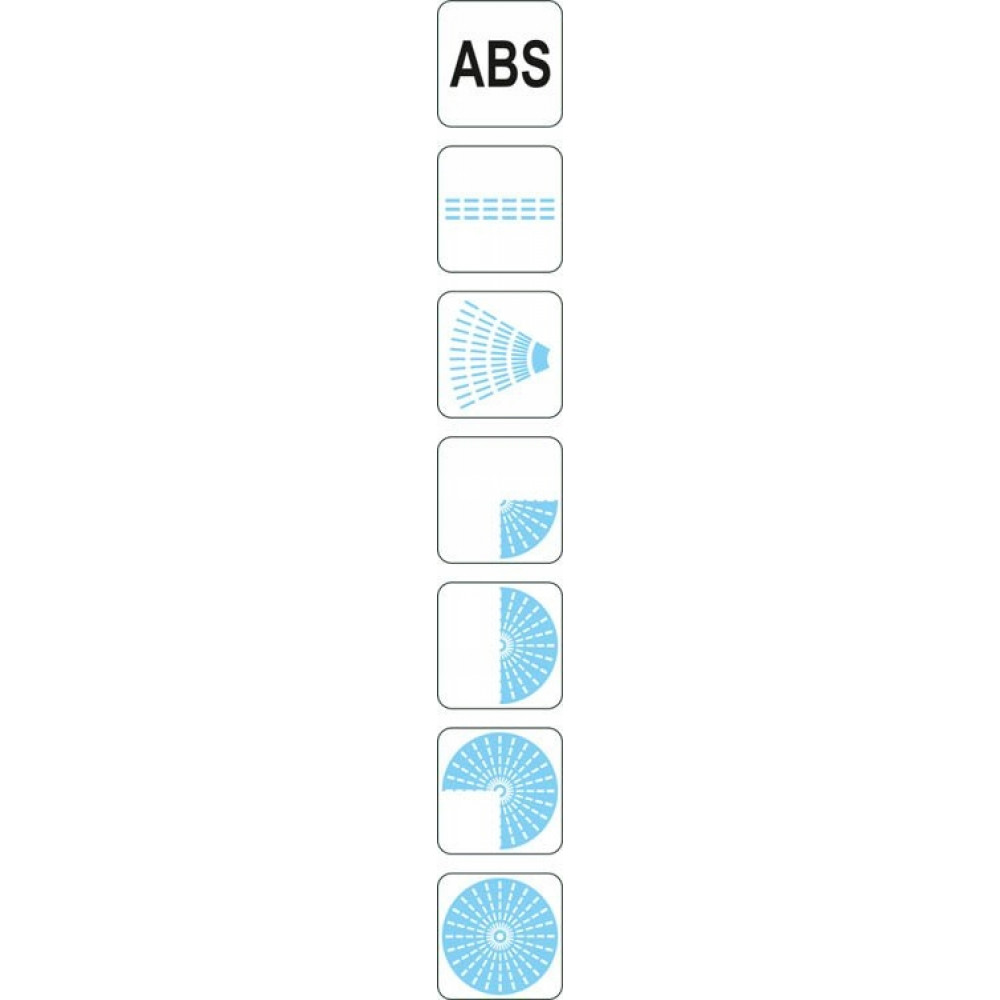 Распылитель выполнен из прочного пластика, защищен от коррозии и имеет диаметр распыления до 24 метров. Для надежного фиксирования распылителя на поверхности, нужно использовать его пластиковую пику особой формы, тем самым предотвратив случайное расшатывание и нарушение необходимого сектора полива. Кроме того, можно быстро перекрыть поток воды с помощью специальной пробки.